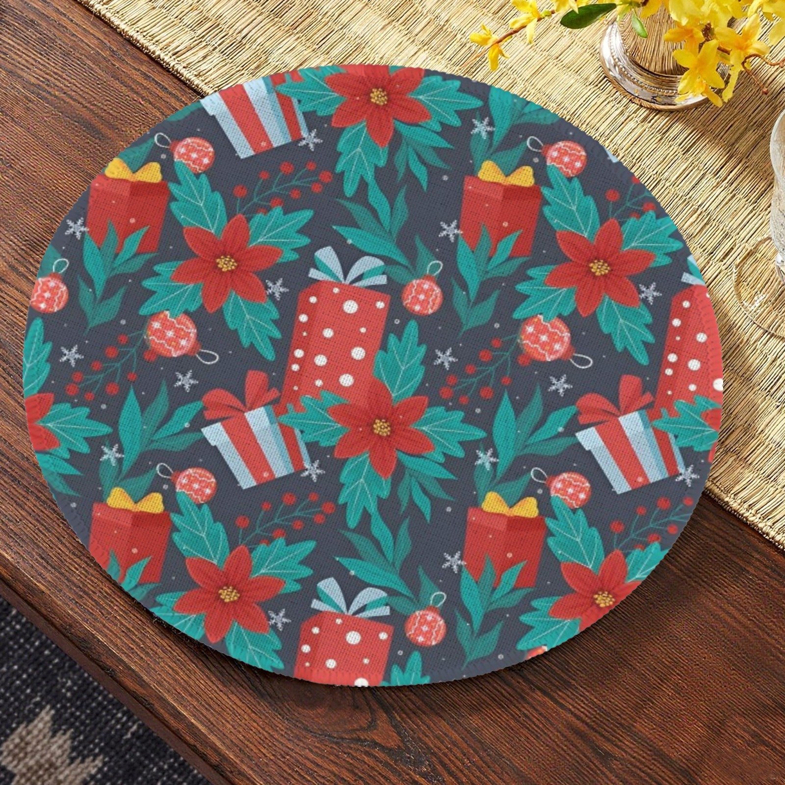 Add festive elegance to your holiday table with these Christmas Placemats featuring a “Floral Gifts” design. These holiday placemats showcase vibrant floral patterns accented with seasonal gift motifs, enhancing your dinner table decor with color and charm. Crafted from premium polyester with a durable non-slip rubber backing, they stay securely in place while protecting your table from spills and scratches. Perfect for Christmas dinners, family gatherings, or holiday parties, these christmas placemats create a warm and inviting seasonal table setting.