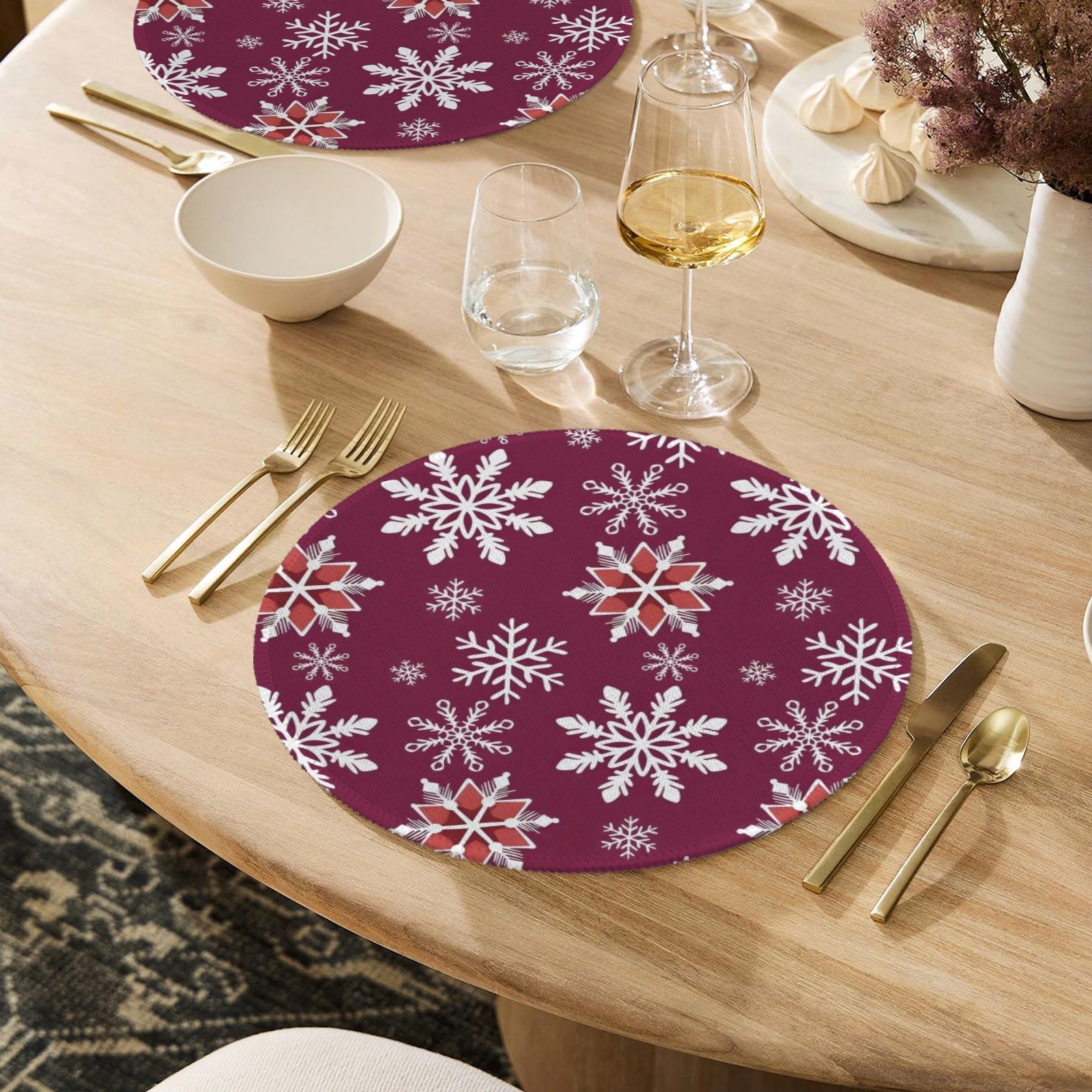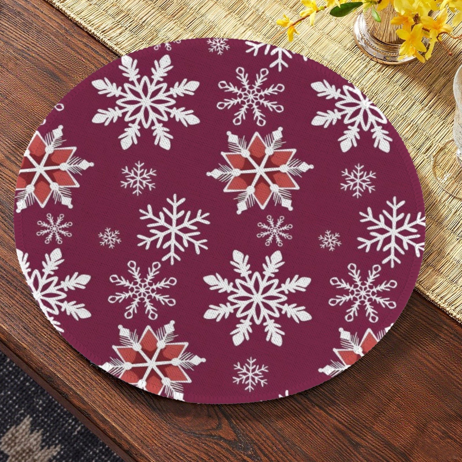 Bring rich, festive style to your holiday table with these Christmas Placemats featuring a “Wine Flakes” design. These holiday placemats showcase deep wine-colored snowflake patterns, adding warmth and seasonal elegance to your dinner table decor. Crafted from premium polyester with a durable non-slip rubber backing, they stay securely in place while protecting your table from spills and scratches. Perfect for Christmas dinners, holiday gatherings, or family celebrations, these christmas placemats create a cozy and sophisticated table setting for the season.