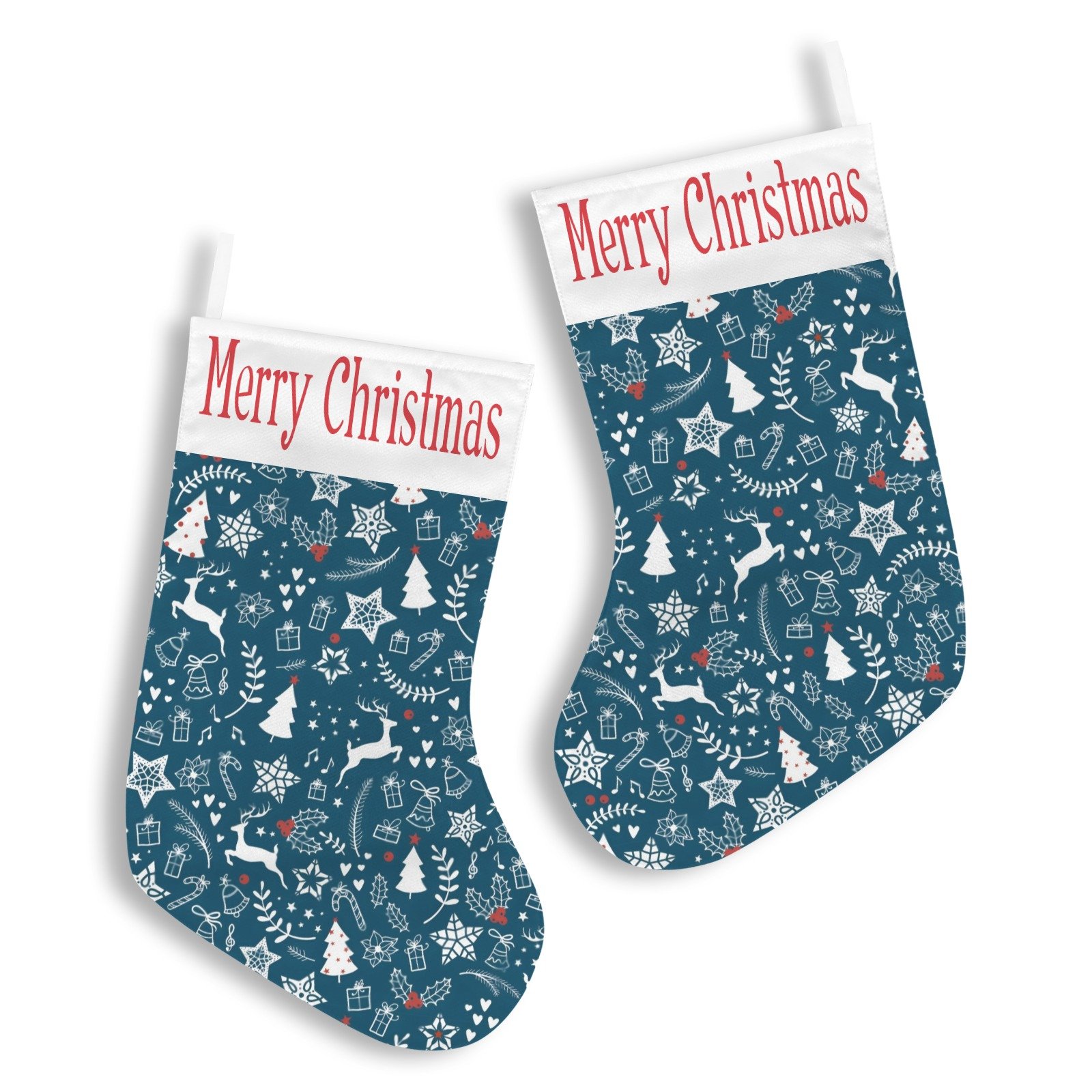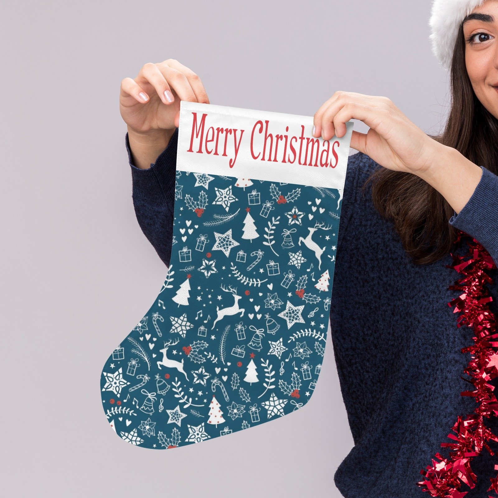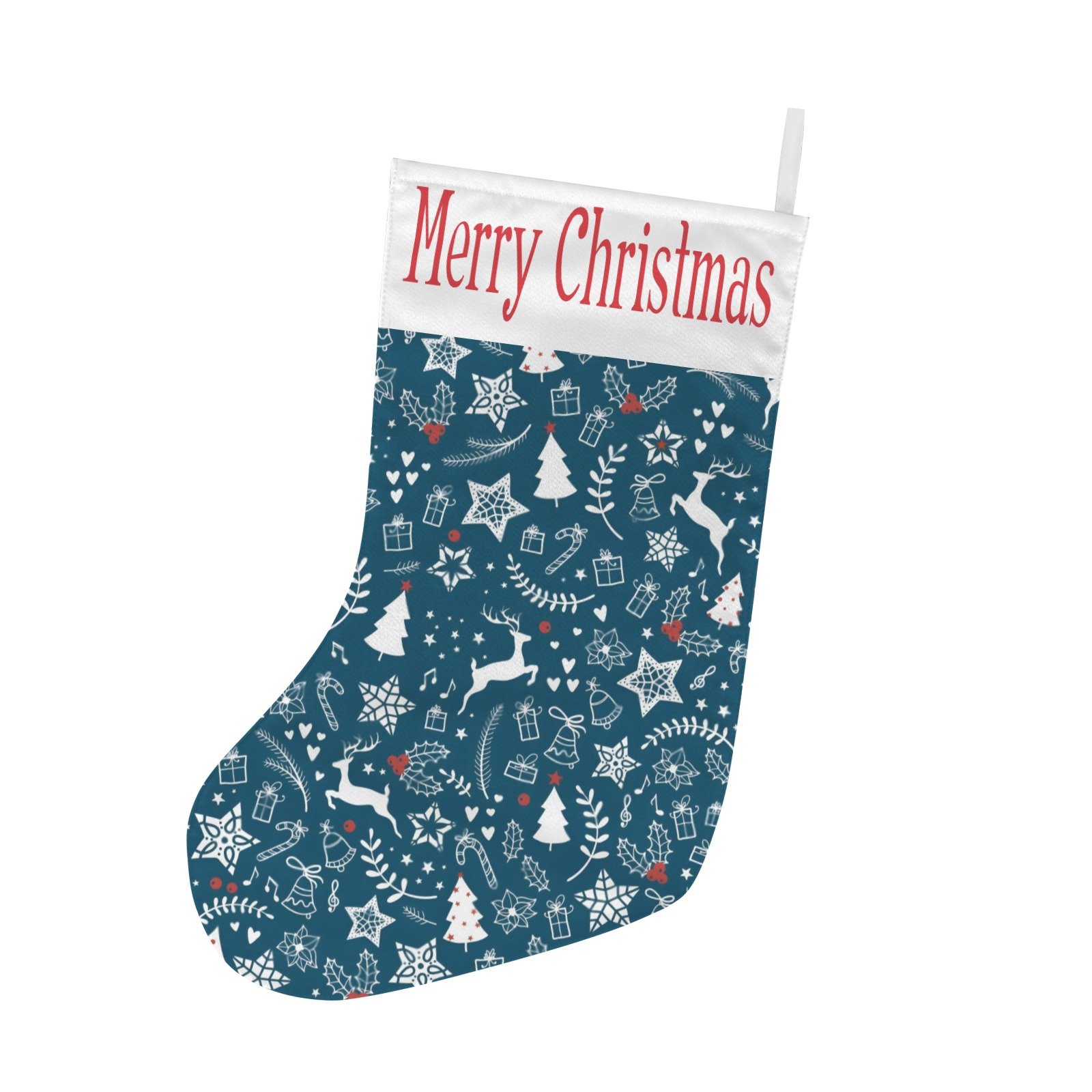 Bring elegant holiday charm to your home with the Christmas Stockings | Holiday Stocking Sock | Blueberries. Featuring a blue background decorated with white deer, snowflakes, red berries, stars, and Christmas trees, this festive stocking adds a classic and whimsical touch to your Christmas decor.