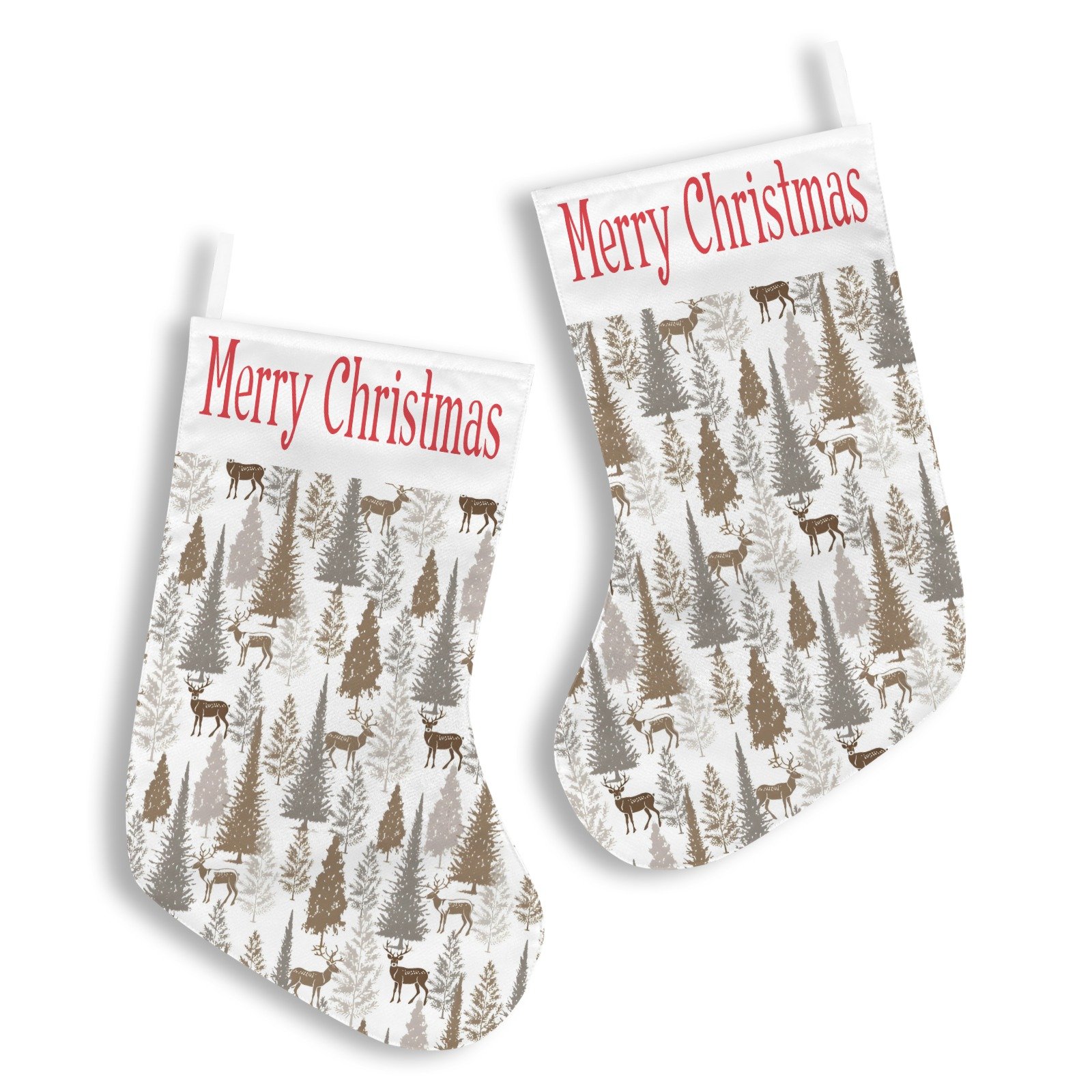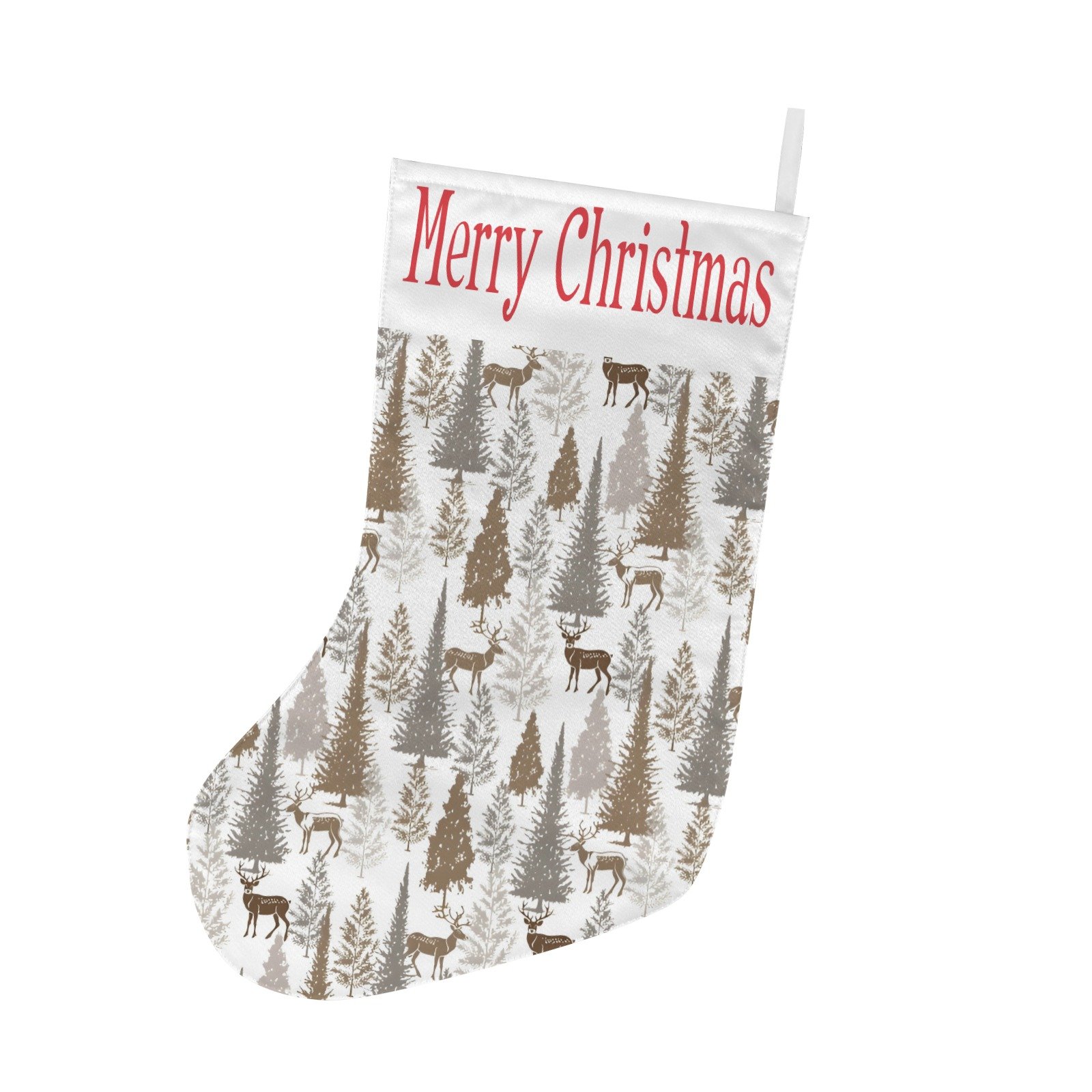 Celebrate a woodland-inspired Christmas with the Christmas Stockings | Holiday Stocking Sock | Bucks. Featuring trees, a forest scene, and reindeer on a white background, this festive stocking brings a charming, nature-inspired touch to your holiday mantel, tree, or seasonal display.