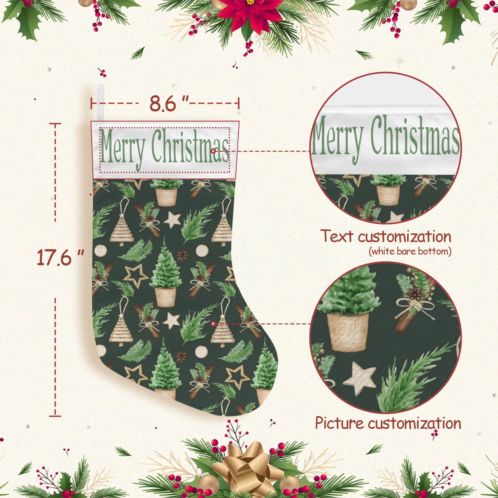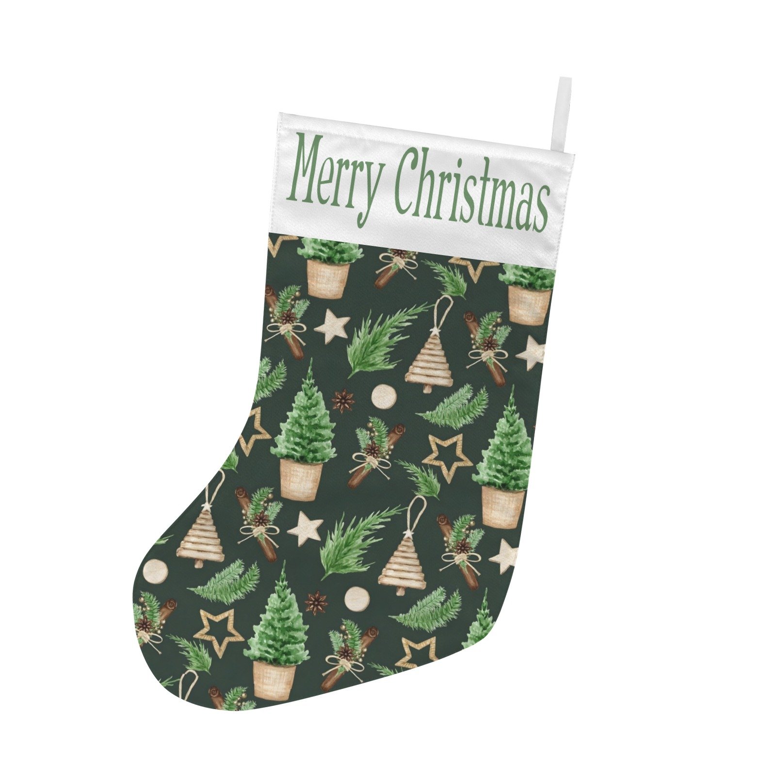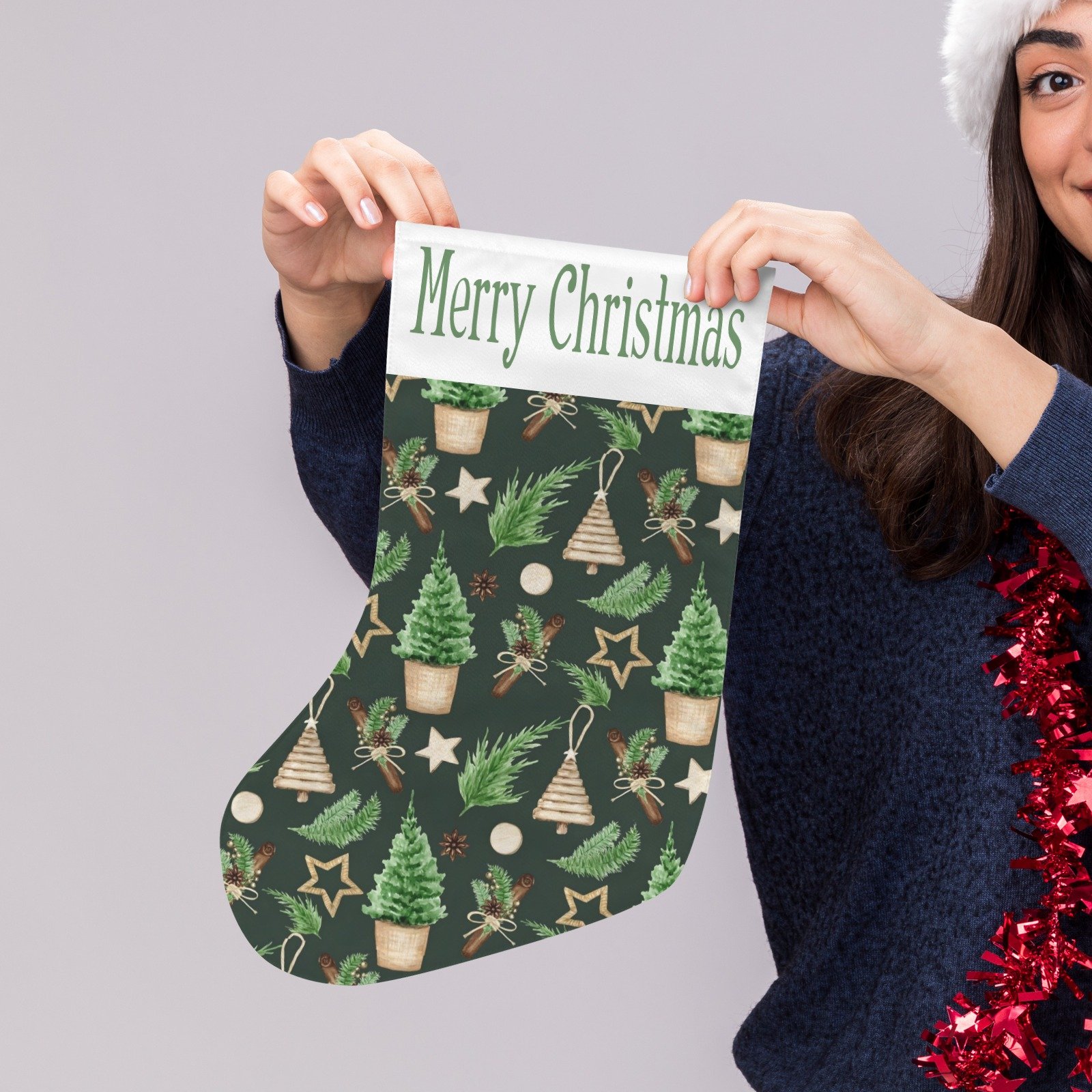 Bring warm holiday charm to your home with the Christmas Stockings | Holiday Stocking Sock | Cinnamon. Featuring potted fir trees and cinnamon sticks, this festive stocking adds a cozy and traditional accent to your Christmas home decor.