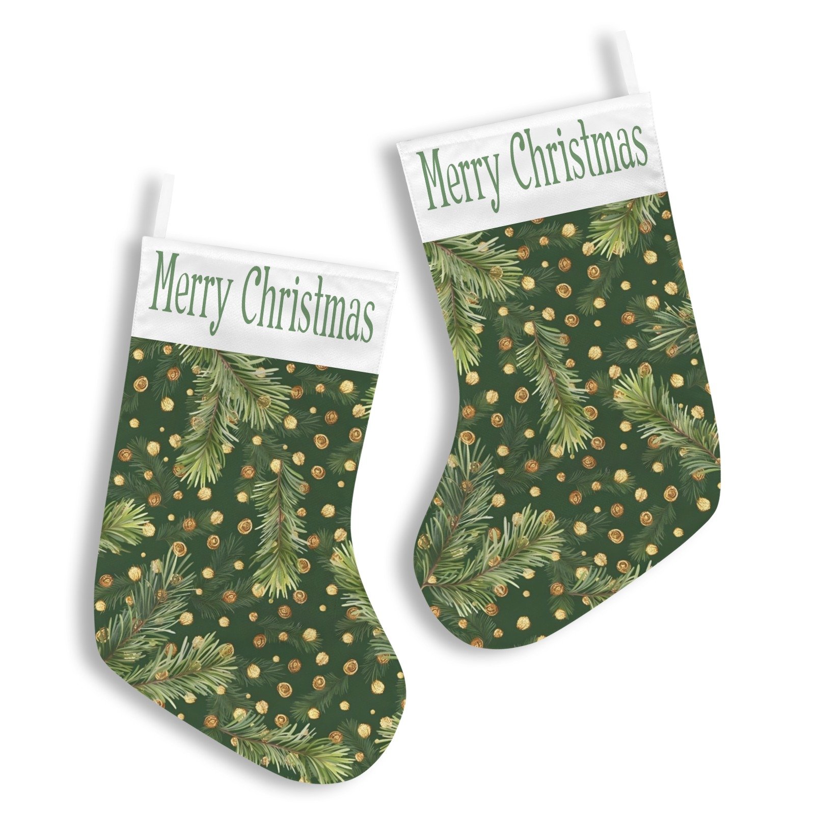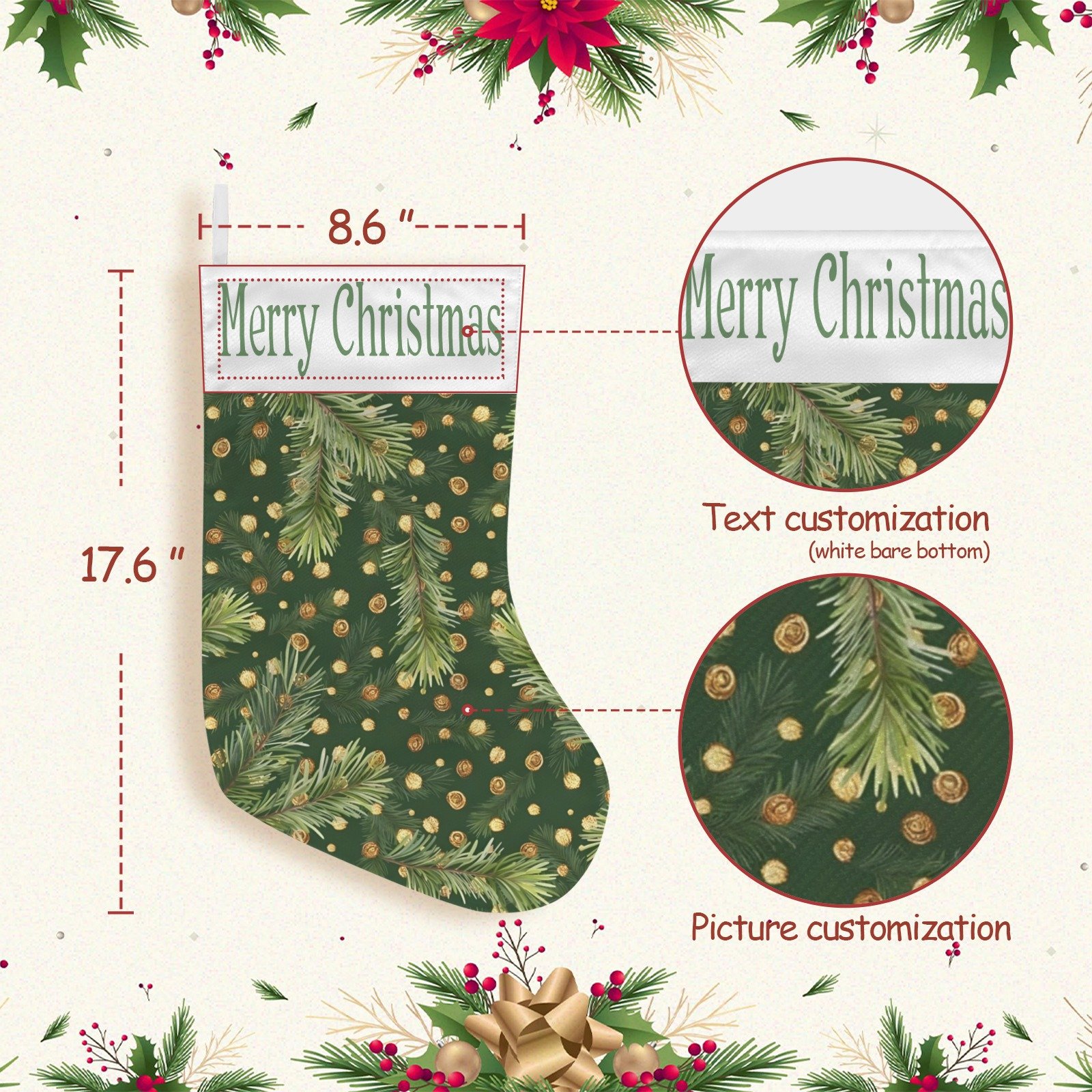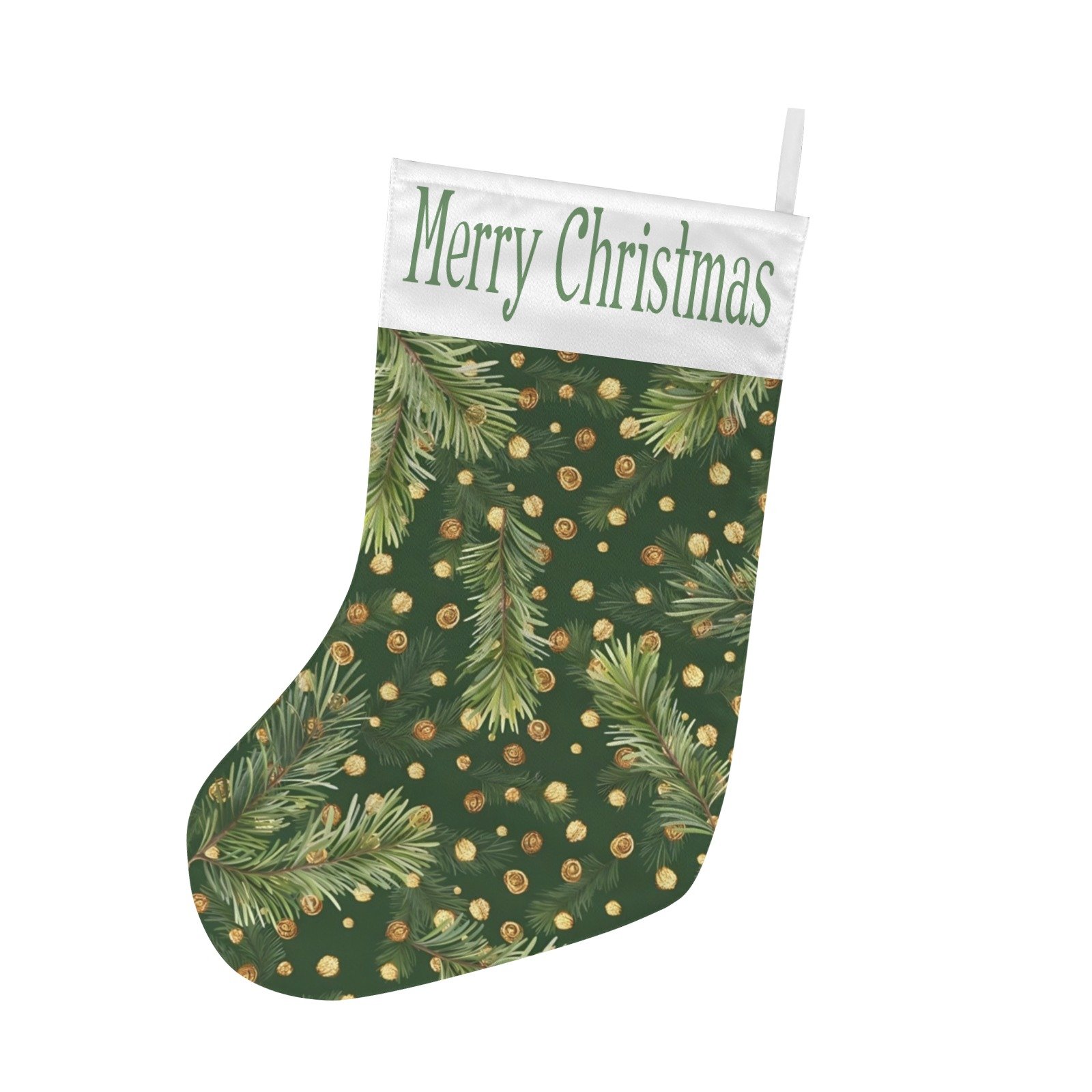 Bring festive elegance to your holiday display with the Christmas Stockings | Holiday Stocking Sock | Gold Pine. Featuring gold berries and pine branches on a rich green background, this stocking adds a luxurious, classic touch to your fireplace mantel, Christmas tree, or seasonal decor.