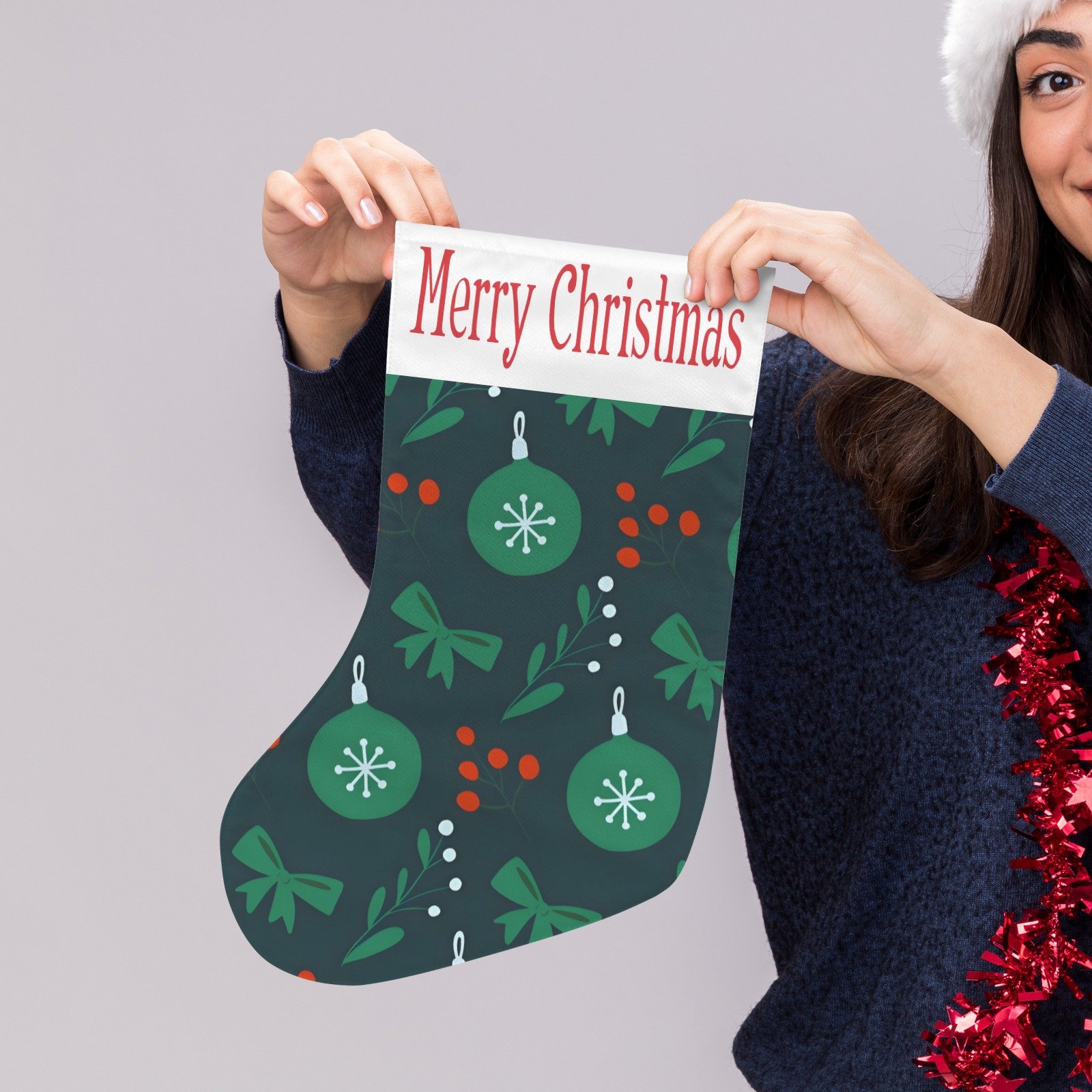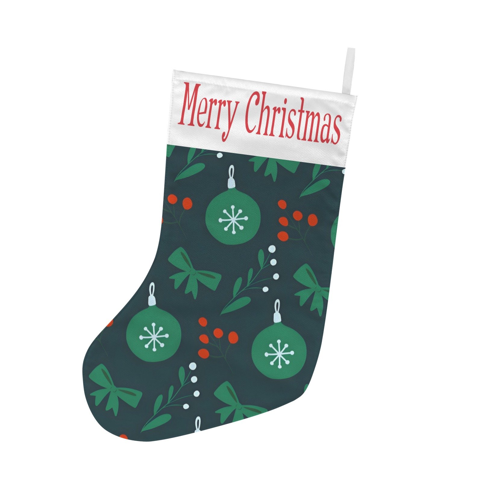 Perfect for holding candies, small gifts, toys, or holiday treats, the Green Ornaments Christmas Stocking adds festive warmth and elegance to your home, making it ideal for family gatherings, gift exchanges, or anyone who loves timeless Christmas style.