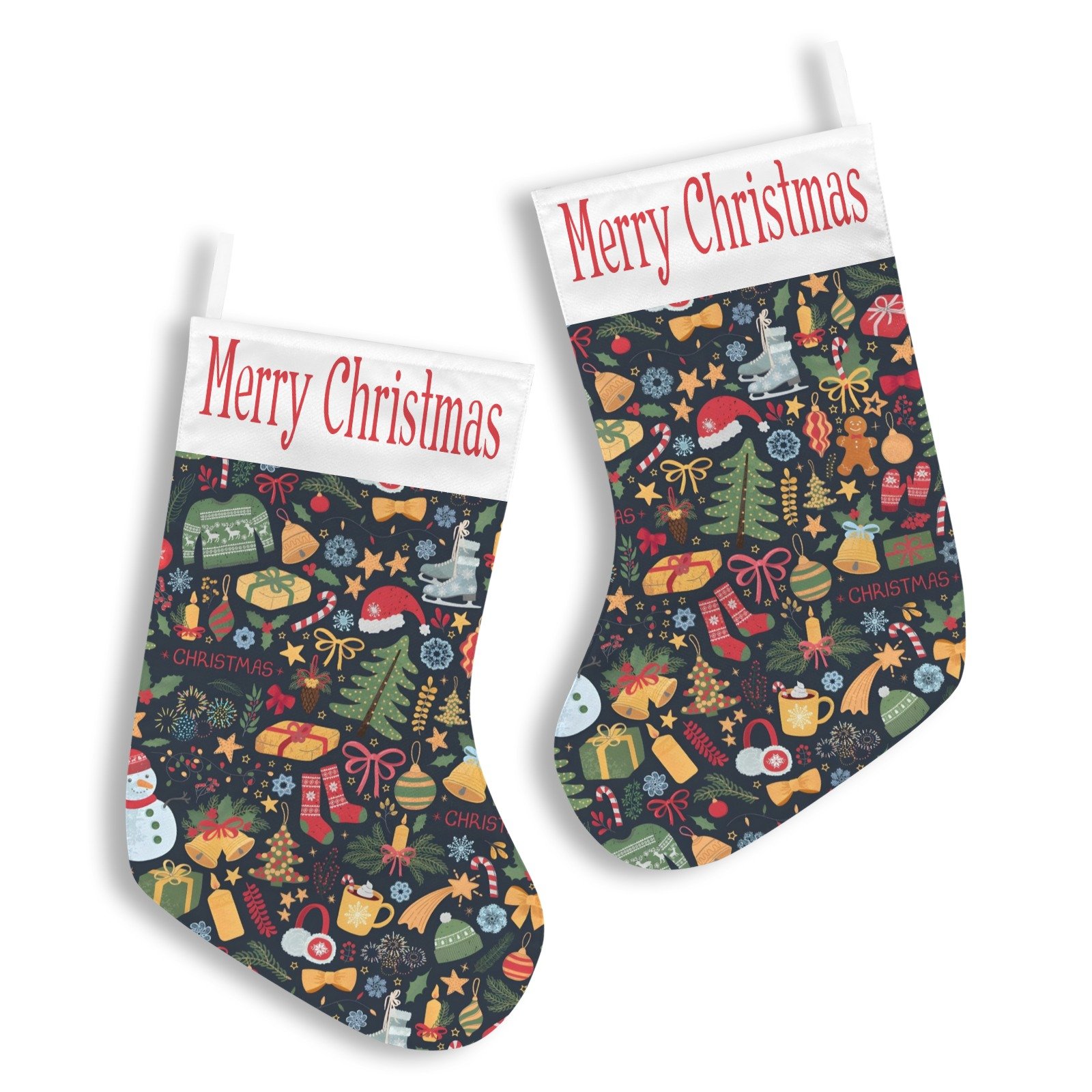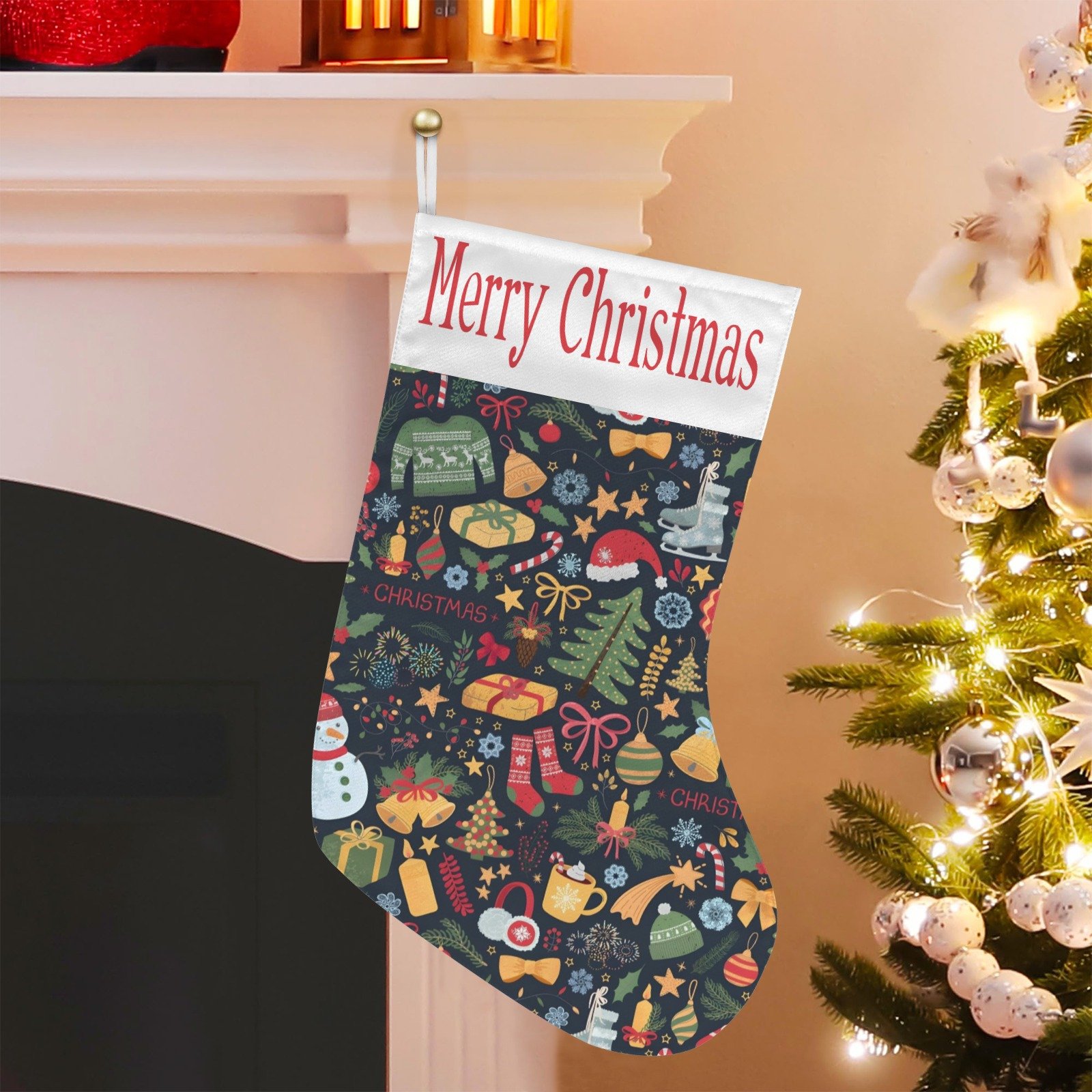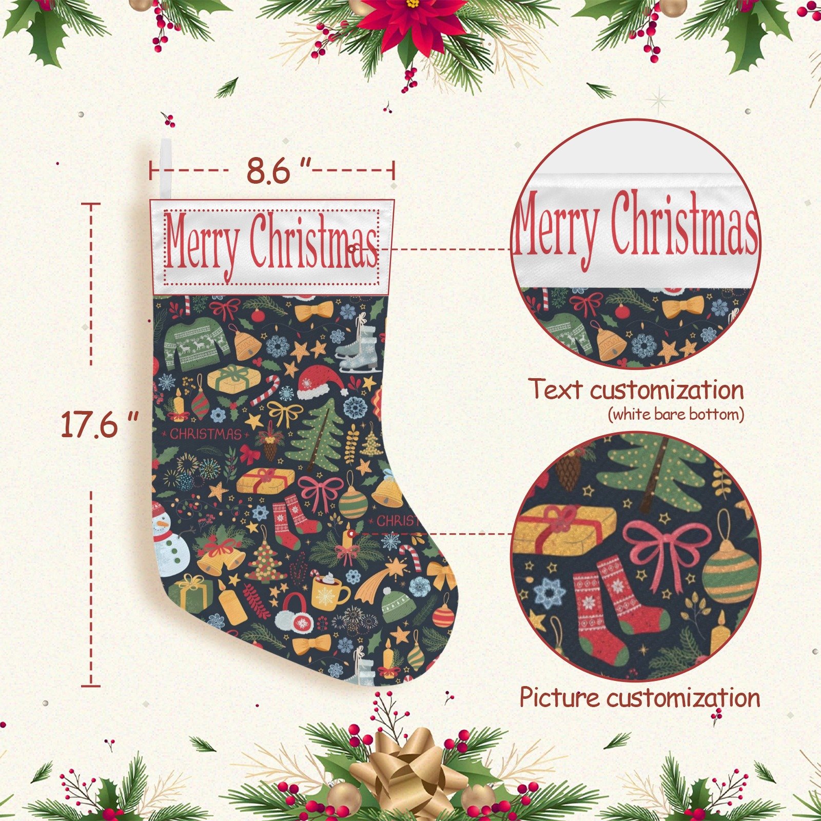 Celebrate the full magic of the season with the Christmas Stockings | Holiday Stocking Sock | Holidays. This festive all-in-one design features gifts, socks, ribbons, Christmas trees, bells, hats, ice skates, and classic holiday decorations, creating a cheerful showcase of everything Christmas represents.