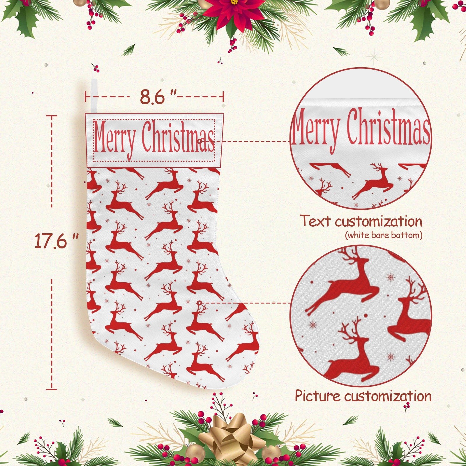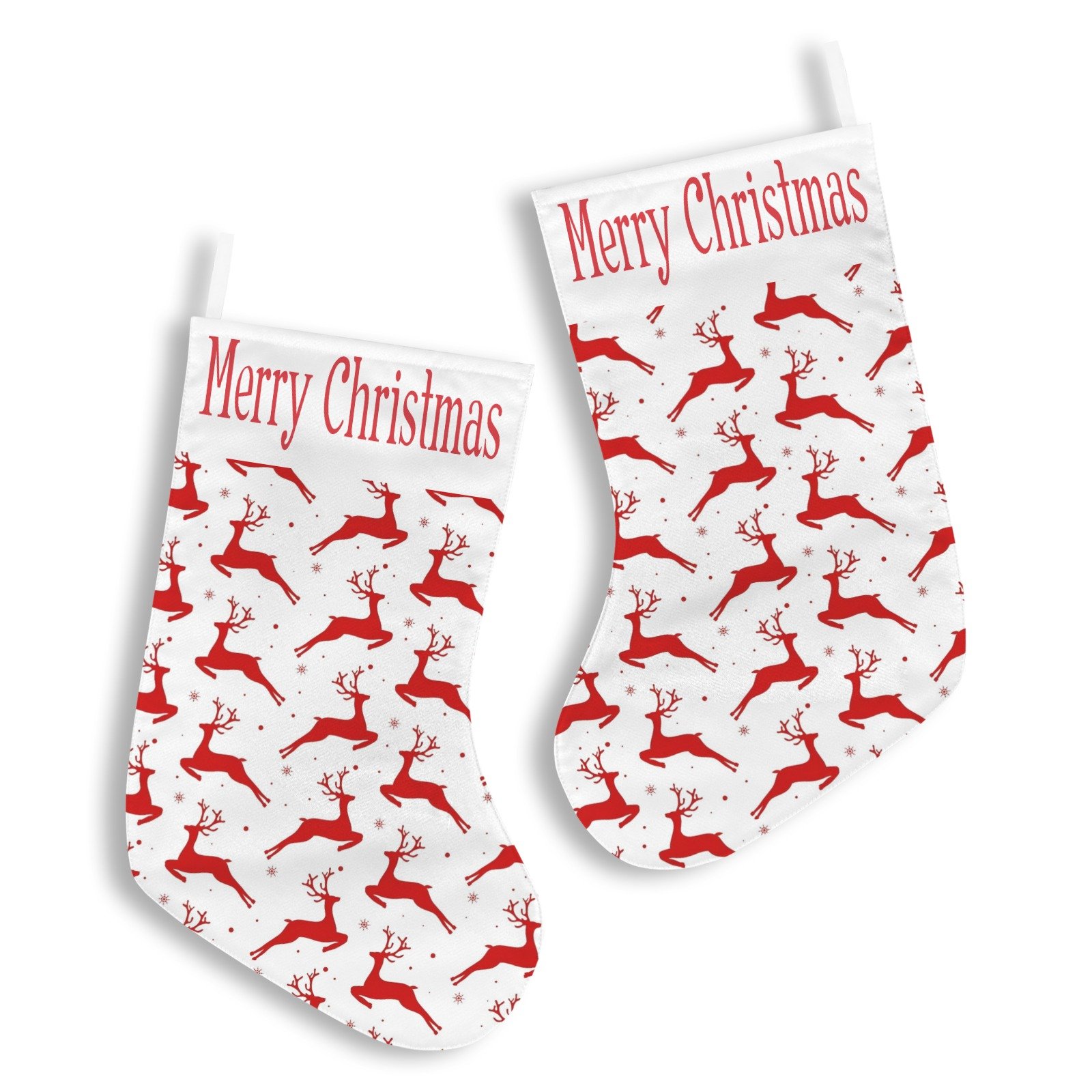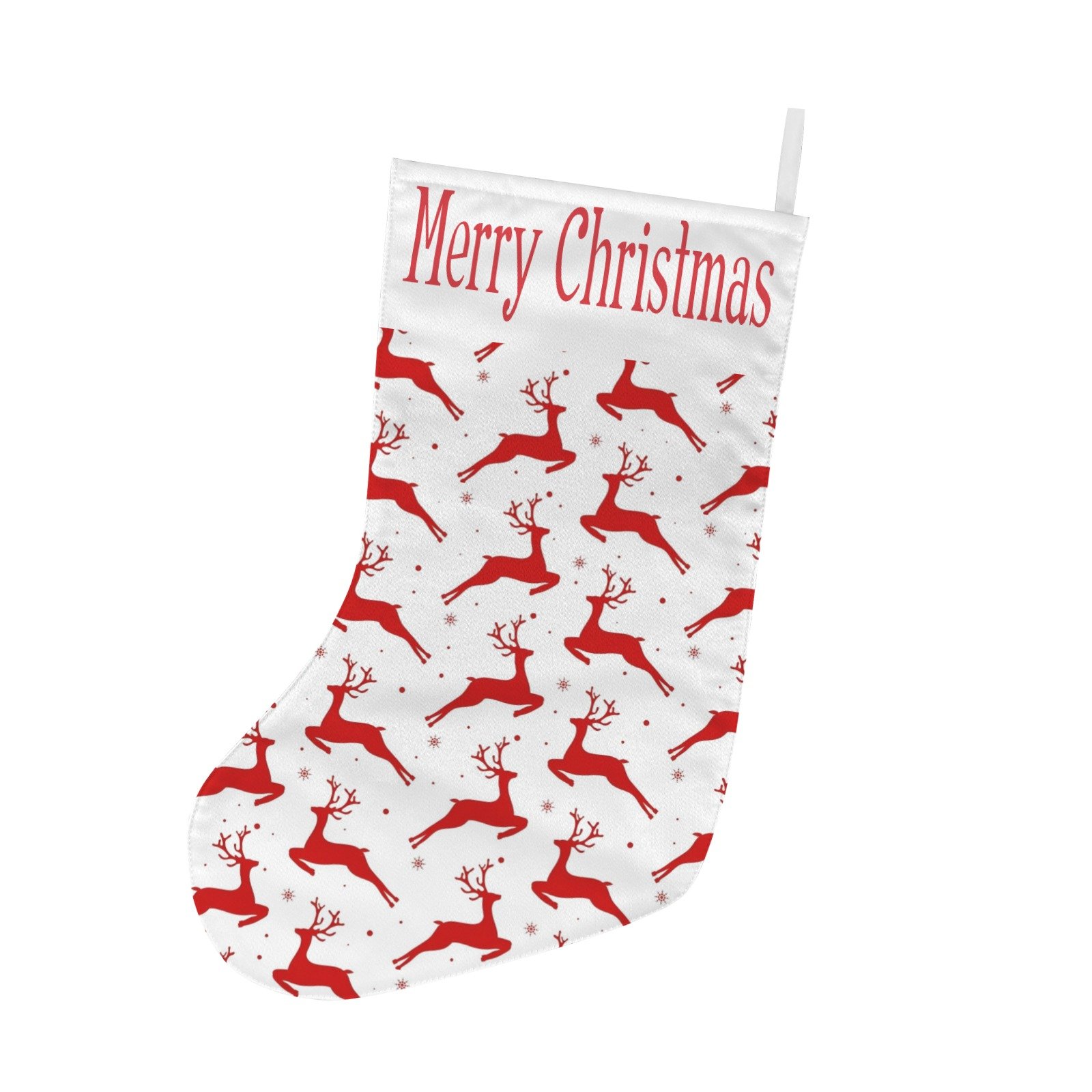 Add a classic and playful touch to your holiday décor with the Christmas Stockings | Holiday Stocking Sock | Jumpers. Featuring a white background adorned with red reindeer, this festive stocking brings a cheerful and traditional accent to your Christmas home decor.
