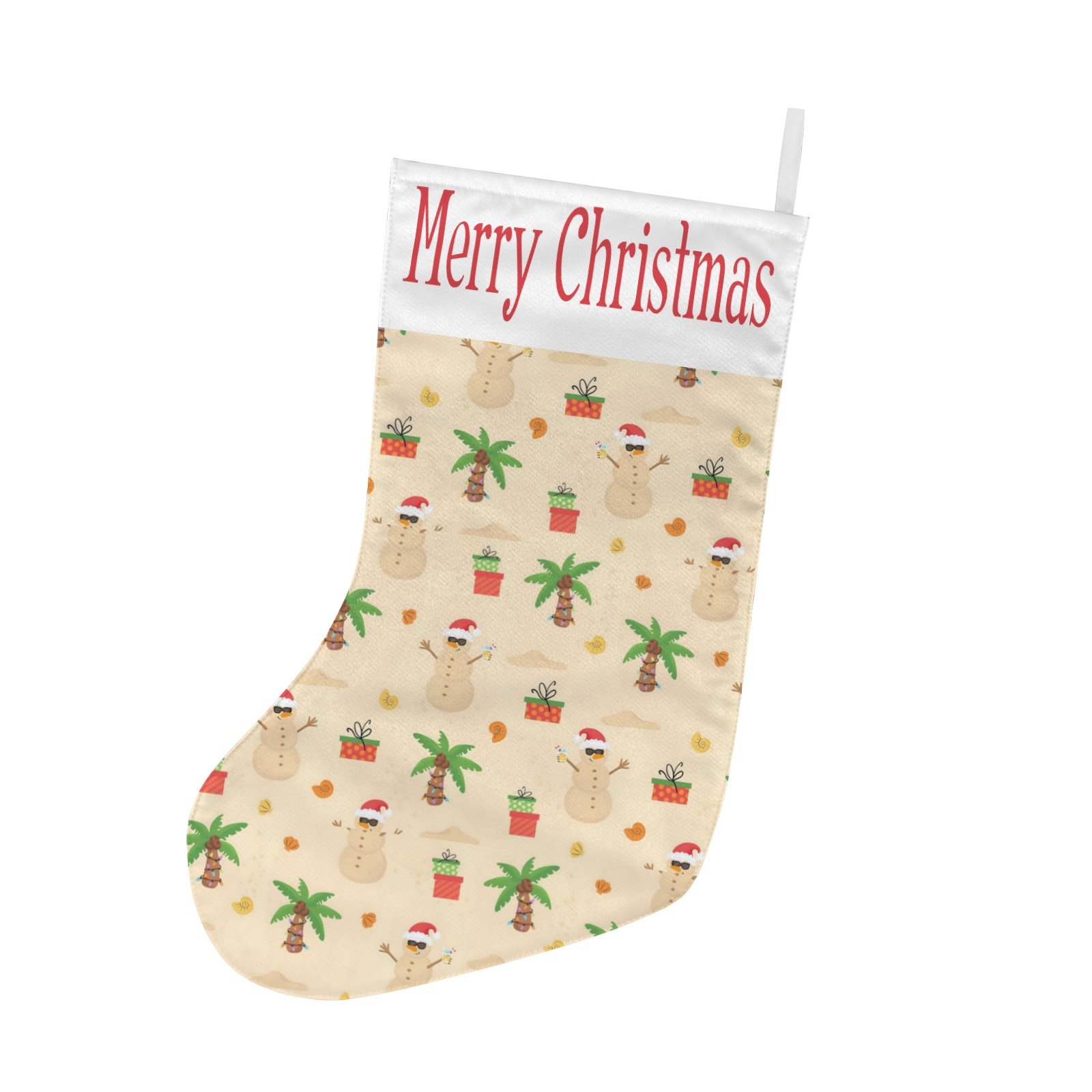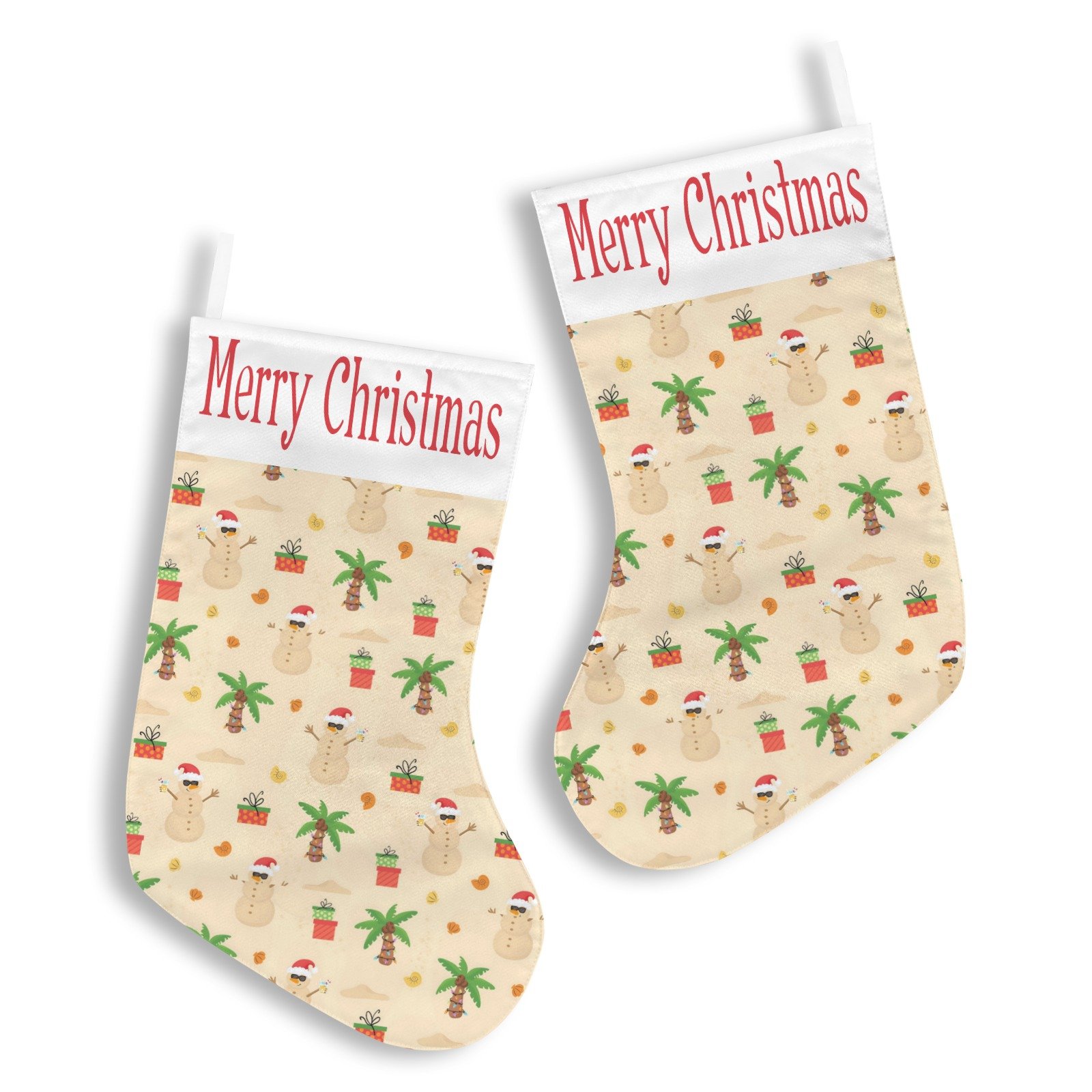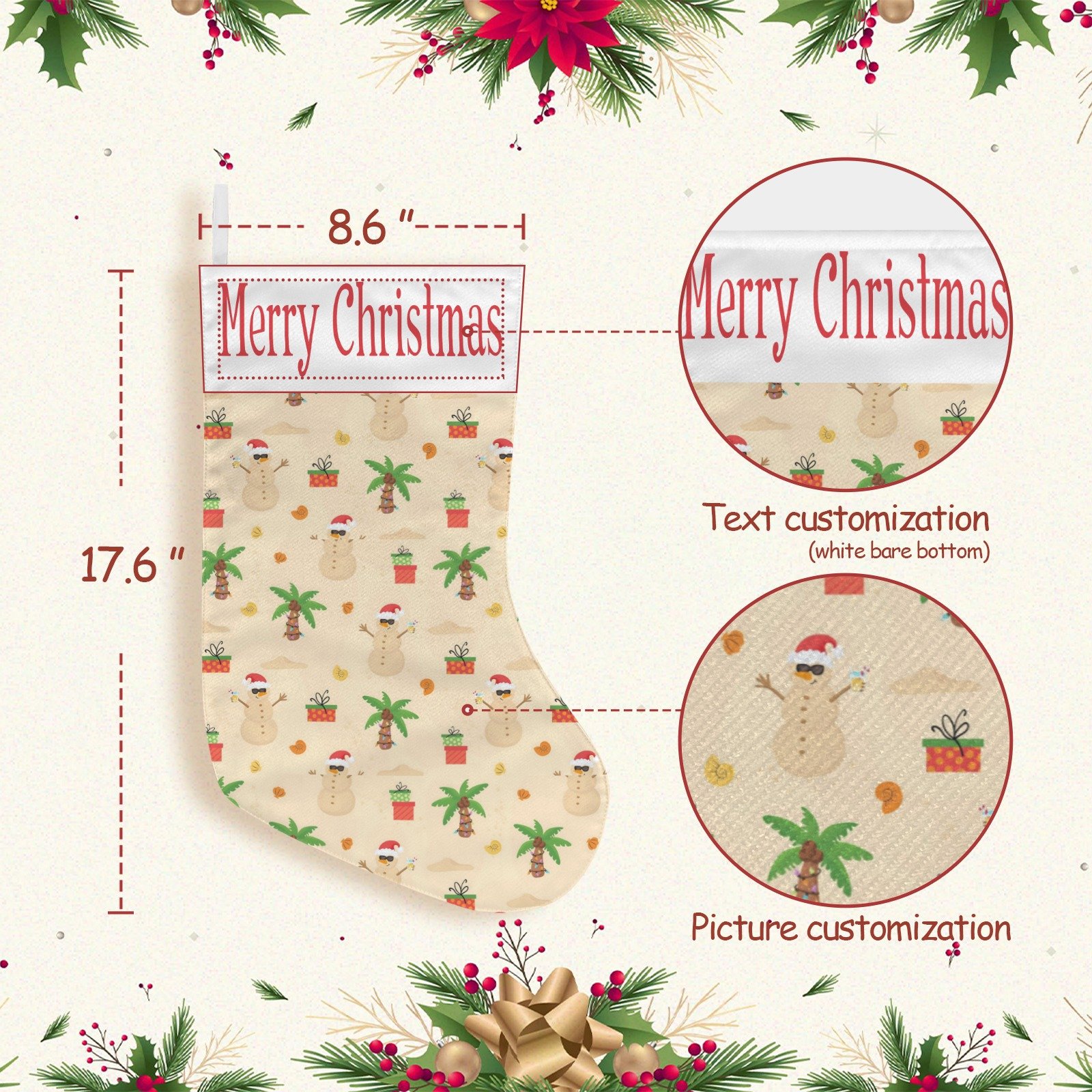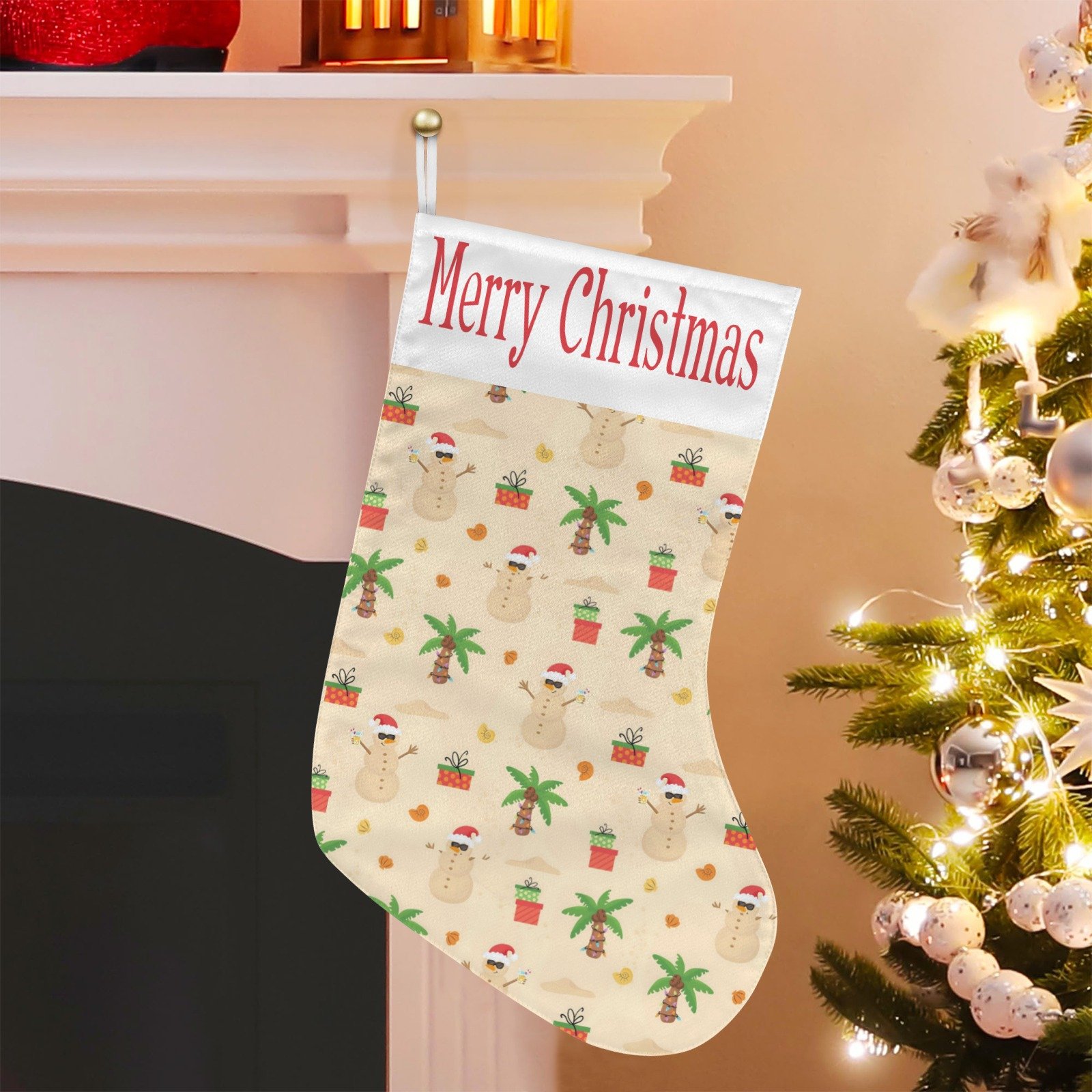 Christmas Stockings with the “Miami” design feature snowmen on a sandy beach scene, adding playful holiday cheer and a tropical twist to your fireplace mantel and seasonal Christmas decor.