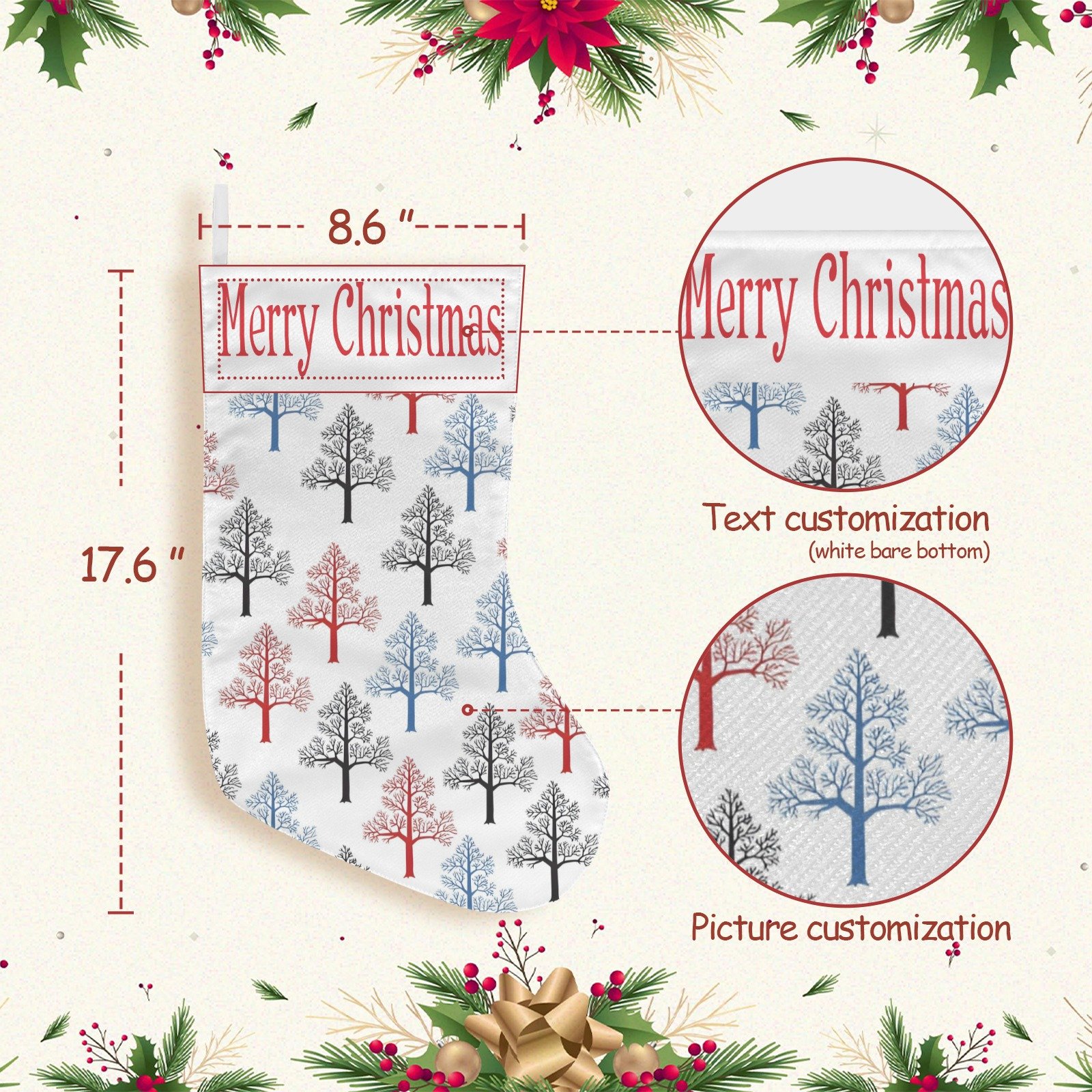 Crafted from 100% premium polyester, this stocking is soft, durable, and fade-resistant, keeping the bright colors and intricate tree design vivid for many holiday seasons. Measuring 17.6″(L) × 8.6″(W) with a 3.9″ white cuff, it comes with a white hanging ribbon for easy display anywhere in your home.