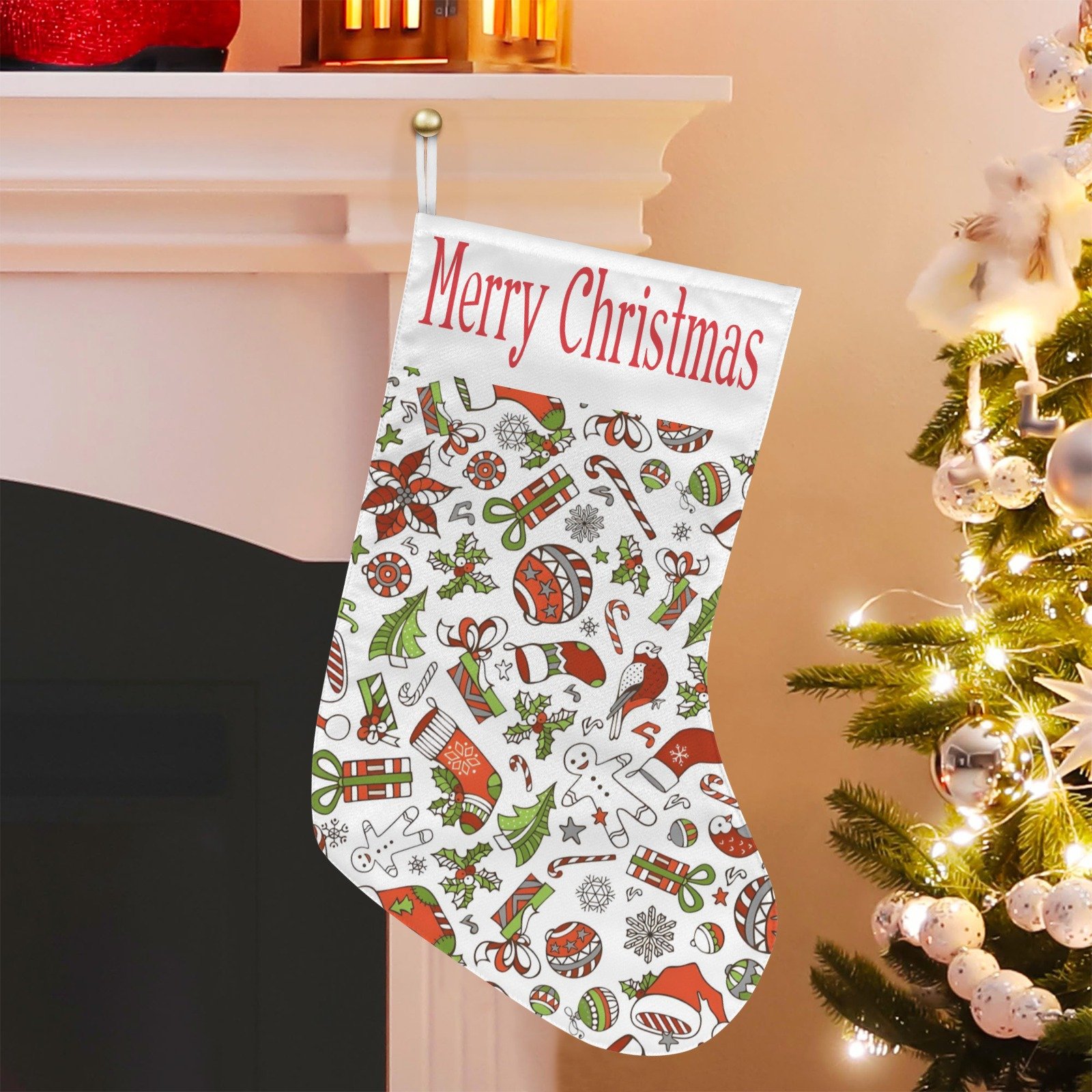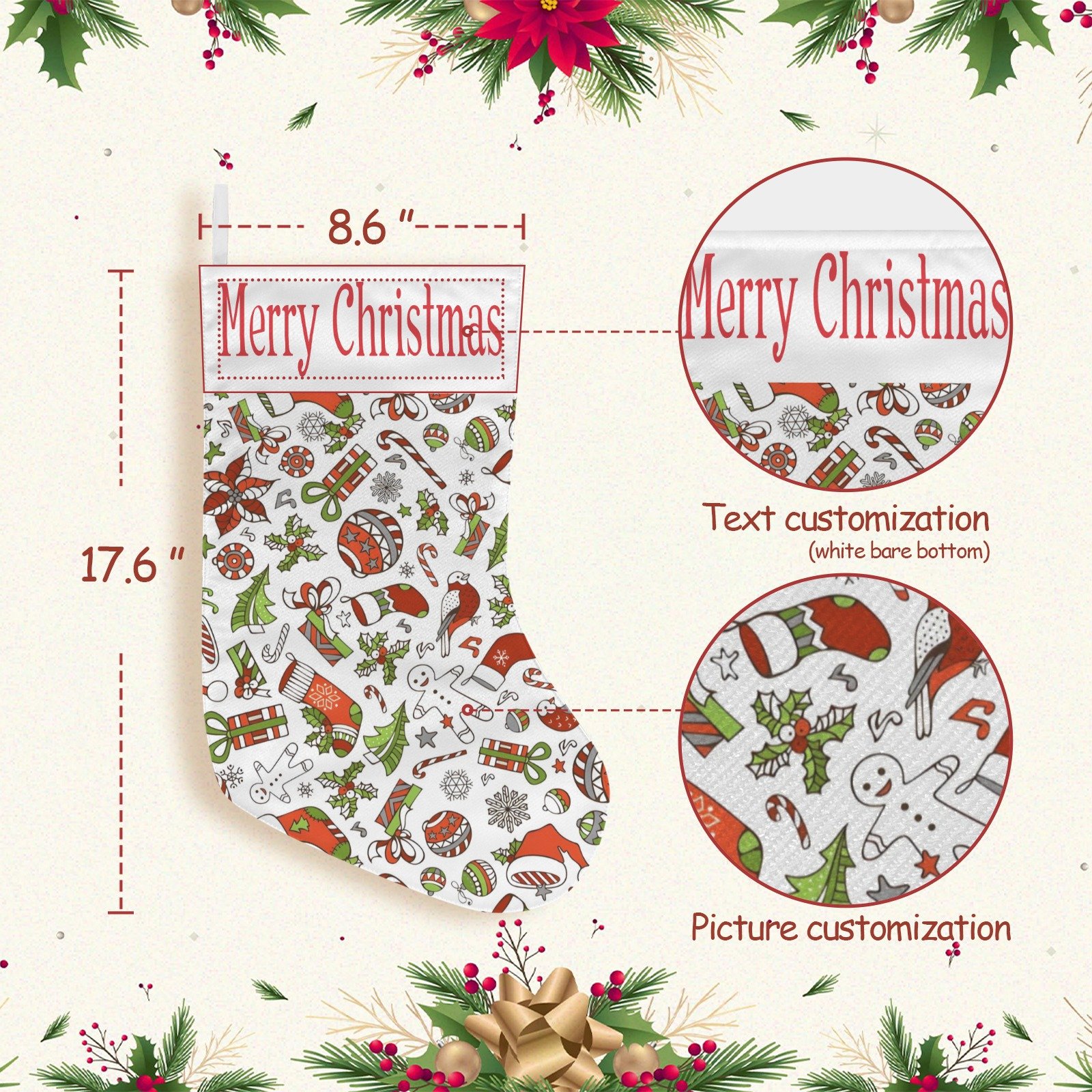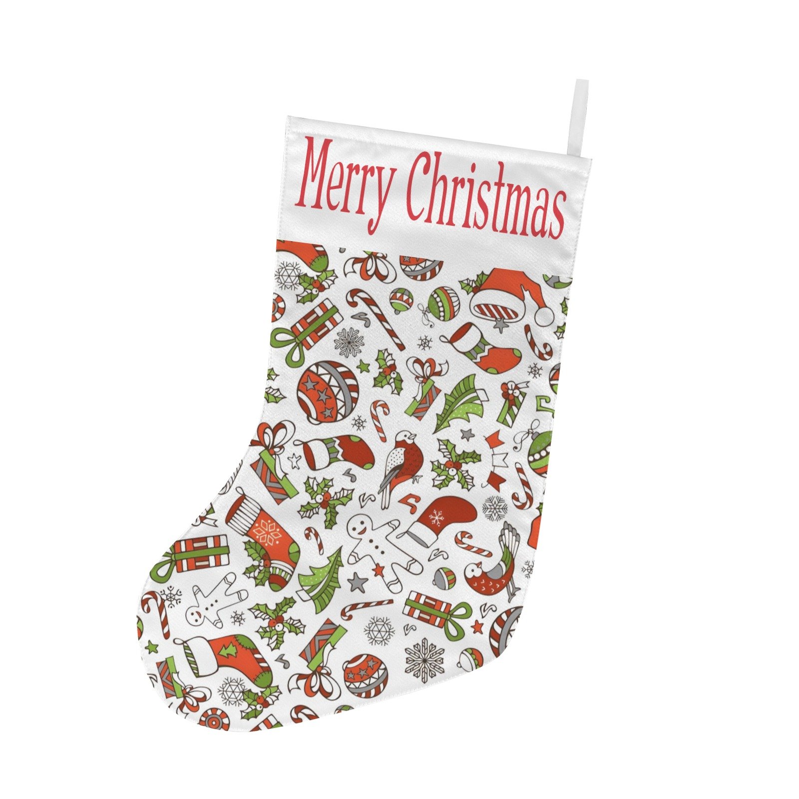 Bring timeless holiday cheer to your home with the Christmas Stockings | Holiday Stocking Sock | Partridge. Featuring stockings, candy canes, Christmas trees, ornaments, and gifts on a white background, this festive stocking adds a classic and playful touch to any holiday display.