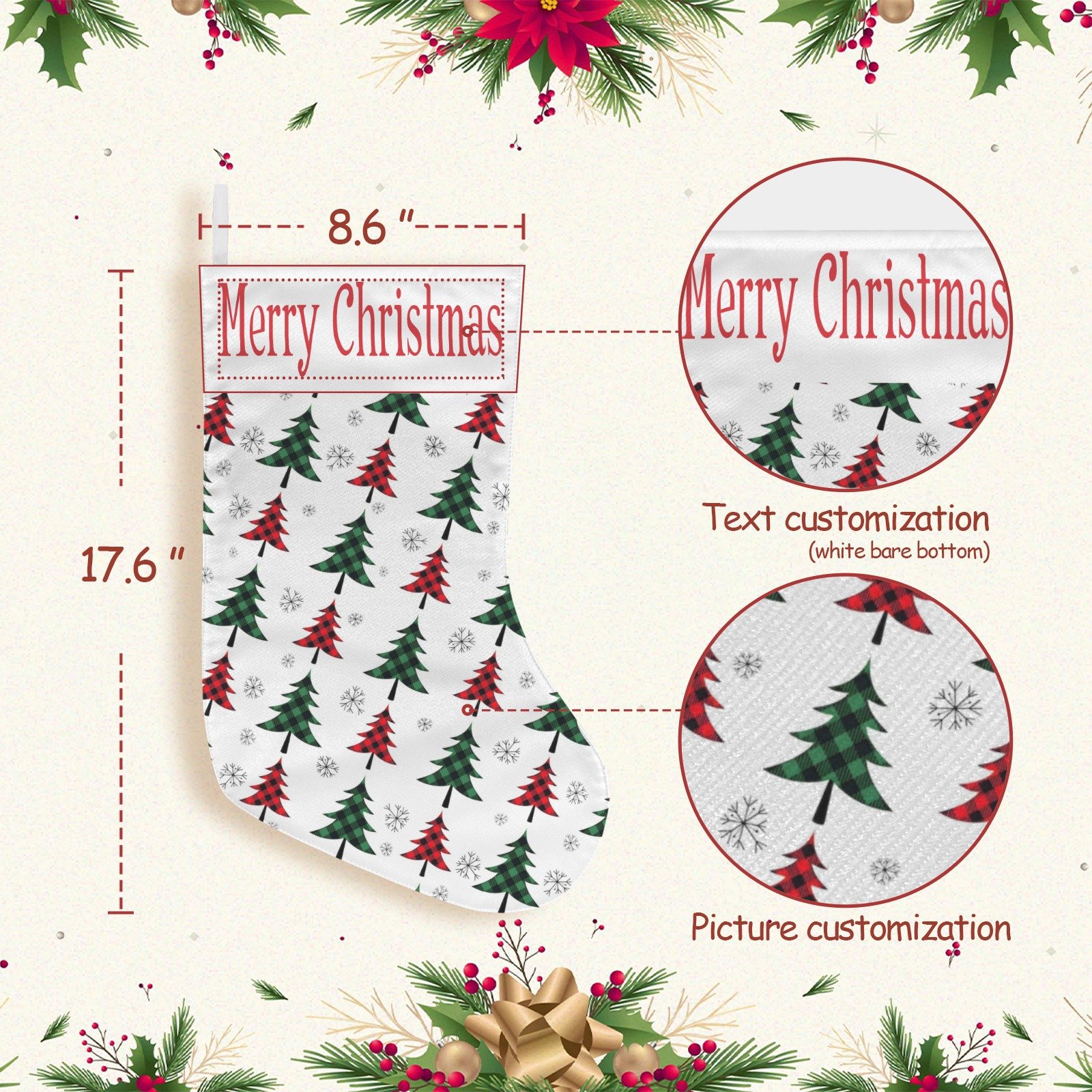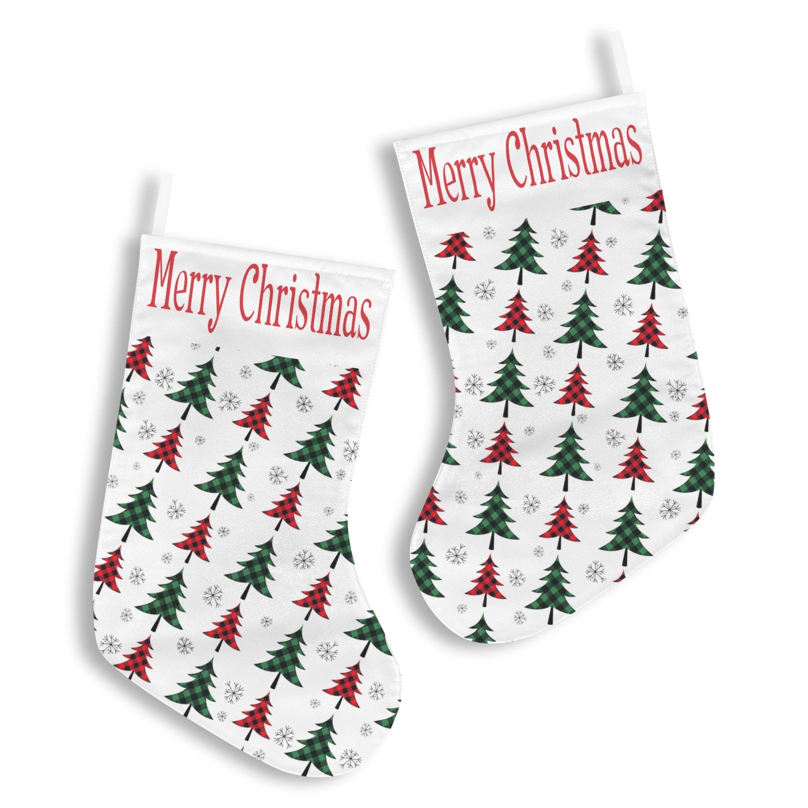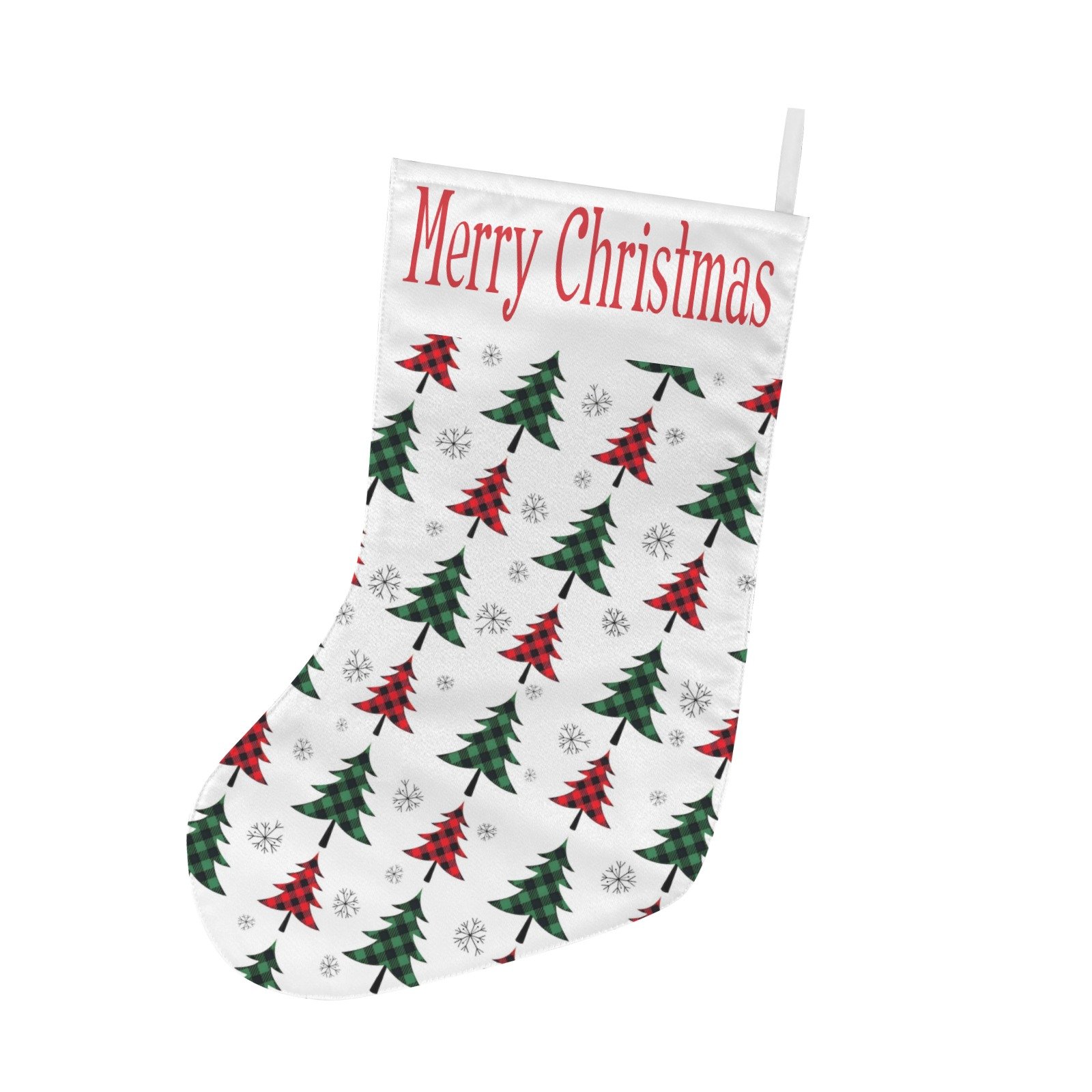 Bring timeless holiday charm to your home with the Christmas Stockings in the “Plaid Trees” design. Featuring a crisp white background decorated with alternating red plaid and green plaid Christmas trees, this holiday sock stocking adds a cozy, traditional accent to your Christmas home decor. Made from 100% premium polyester, it’s soft, durable, and designed to maintain its vibrant colors year after year.