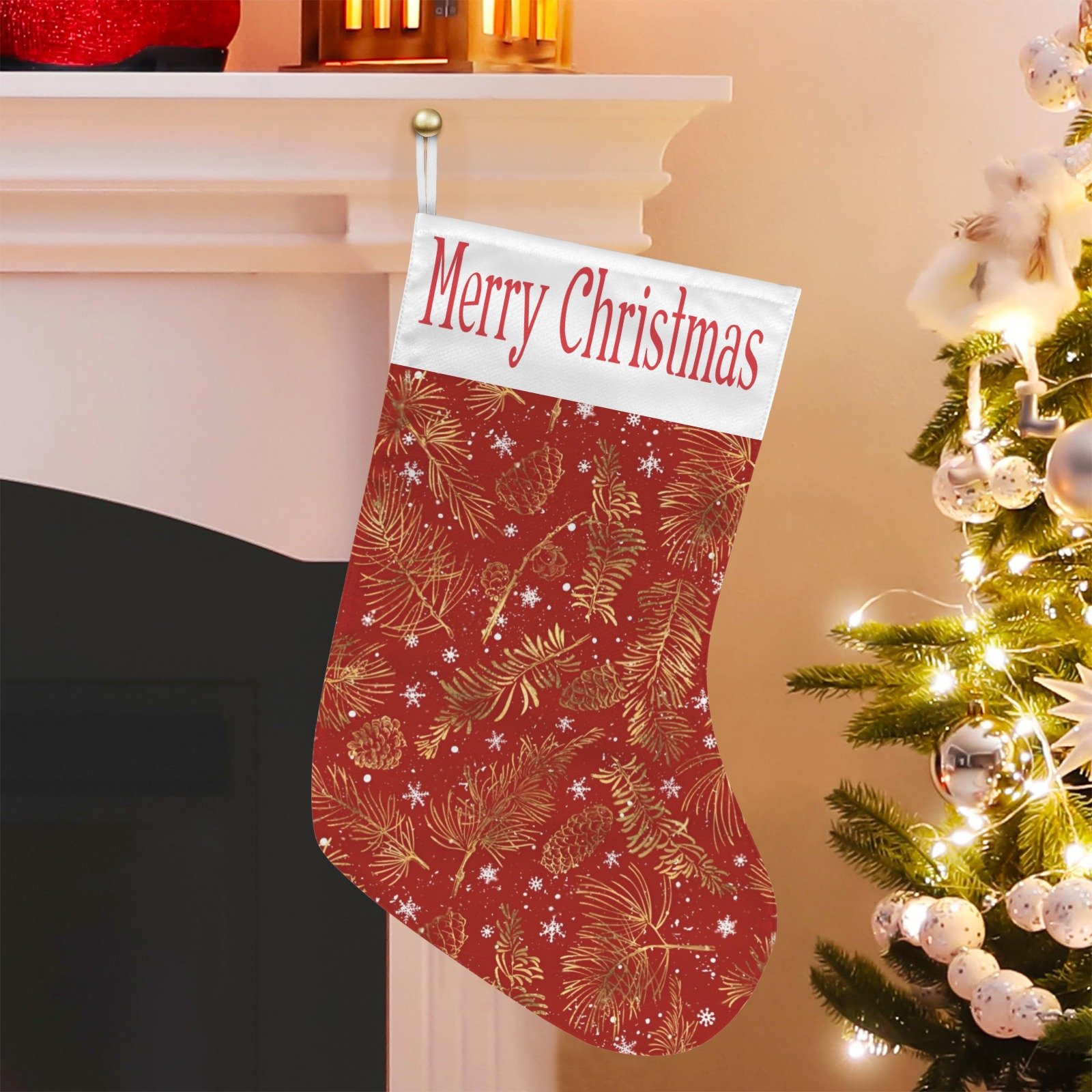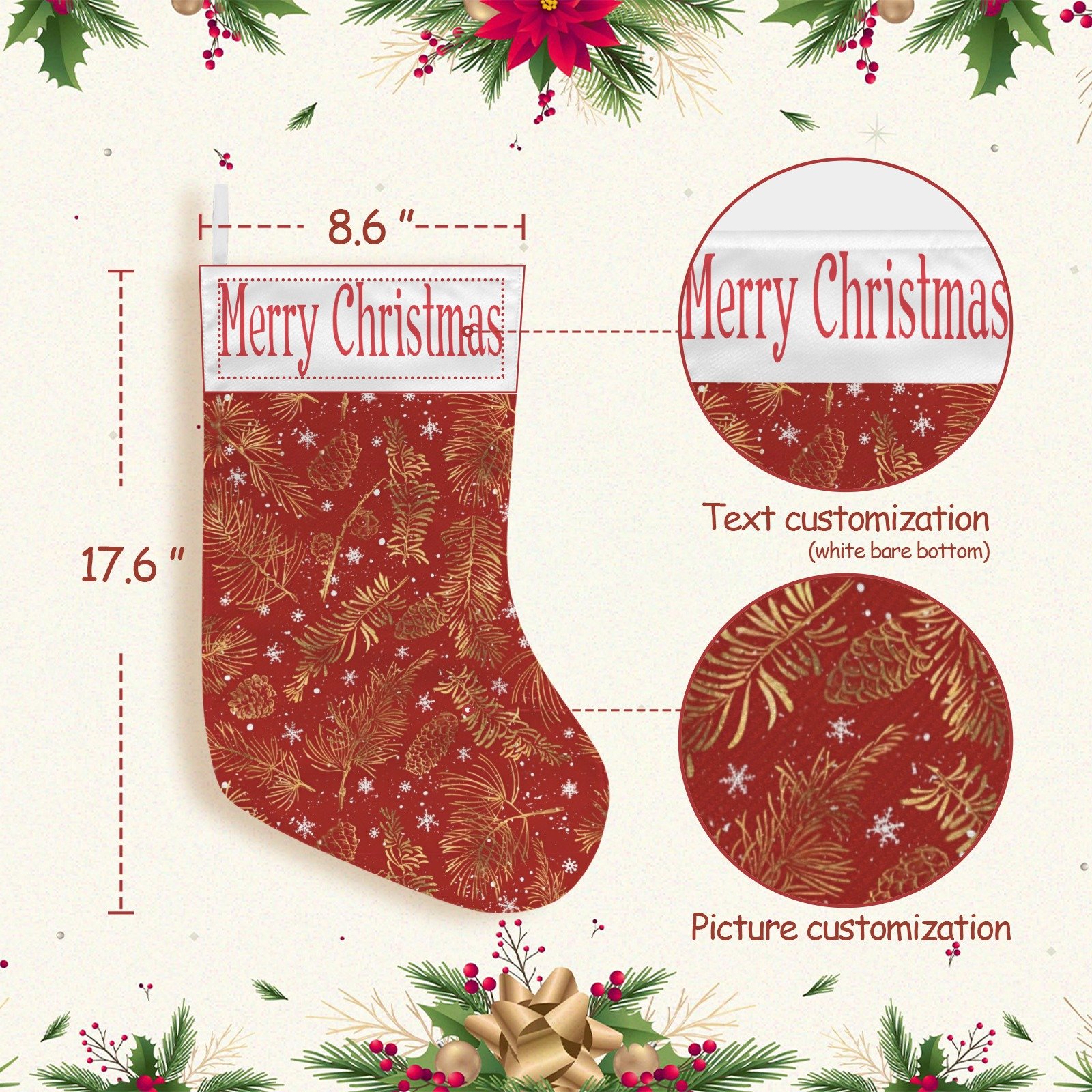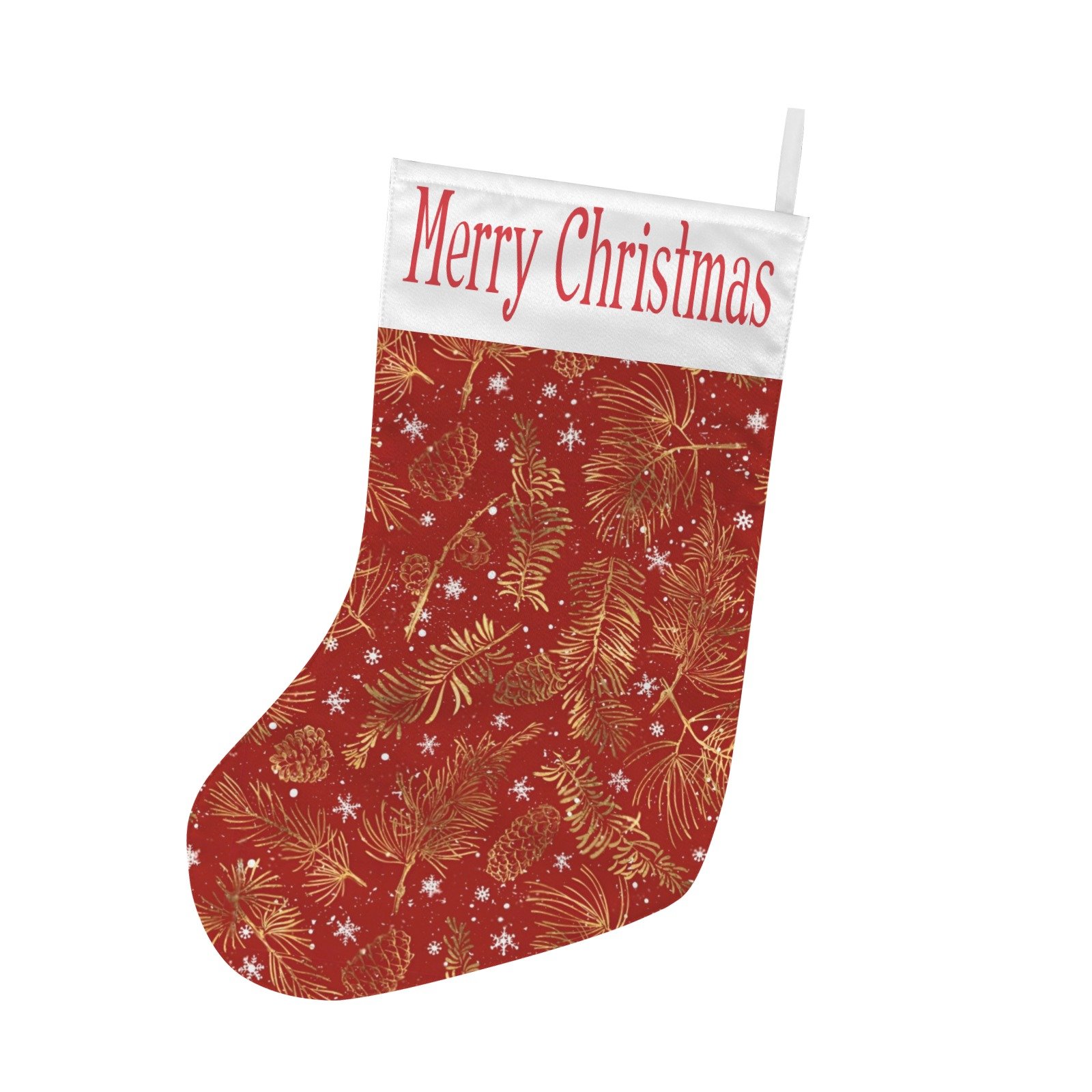 Bring rich holiday warmth to your home with the Christmas Stockings | Holiday Stocking Sock | Red Pines. Featuring a red background adorned with gold pine branches and pinecones, this festive stocking adds a luxurious and traditional touch to your Christmas home decor.