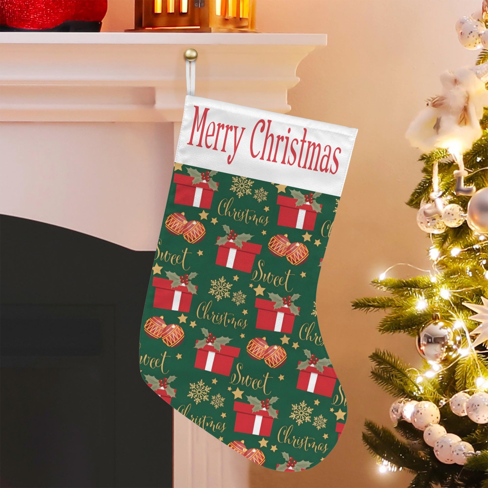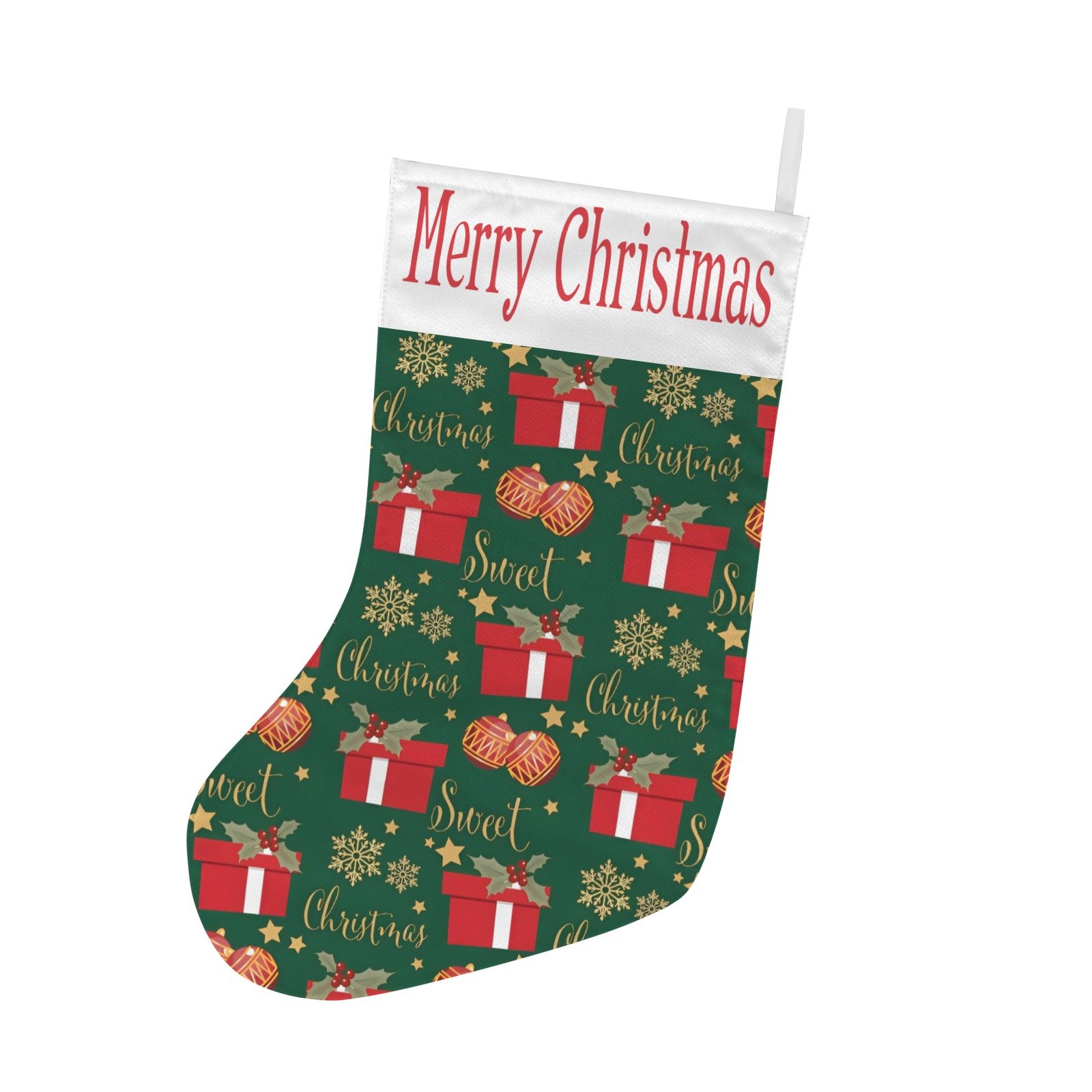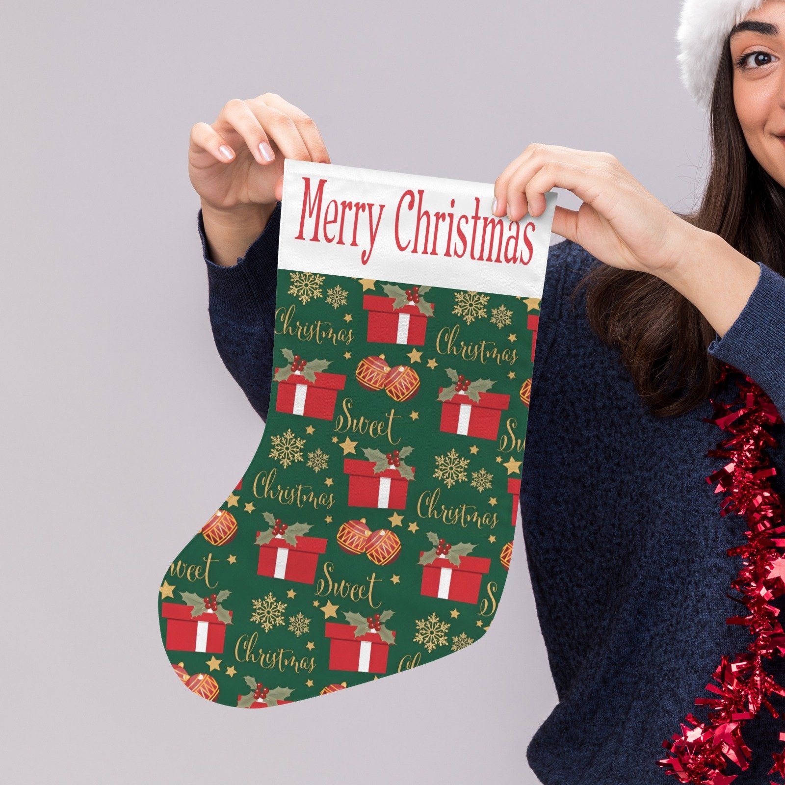 Add festive joy to your home with the Christmas Stockings | Holiday Stocking Sock | Sweet. Featuring a green background decorated with red presents, snowflakes, and “Sweet Christmas” text, this cheerful stocking brings playful holiday charm to any space.