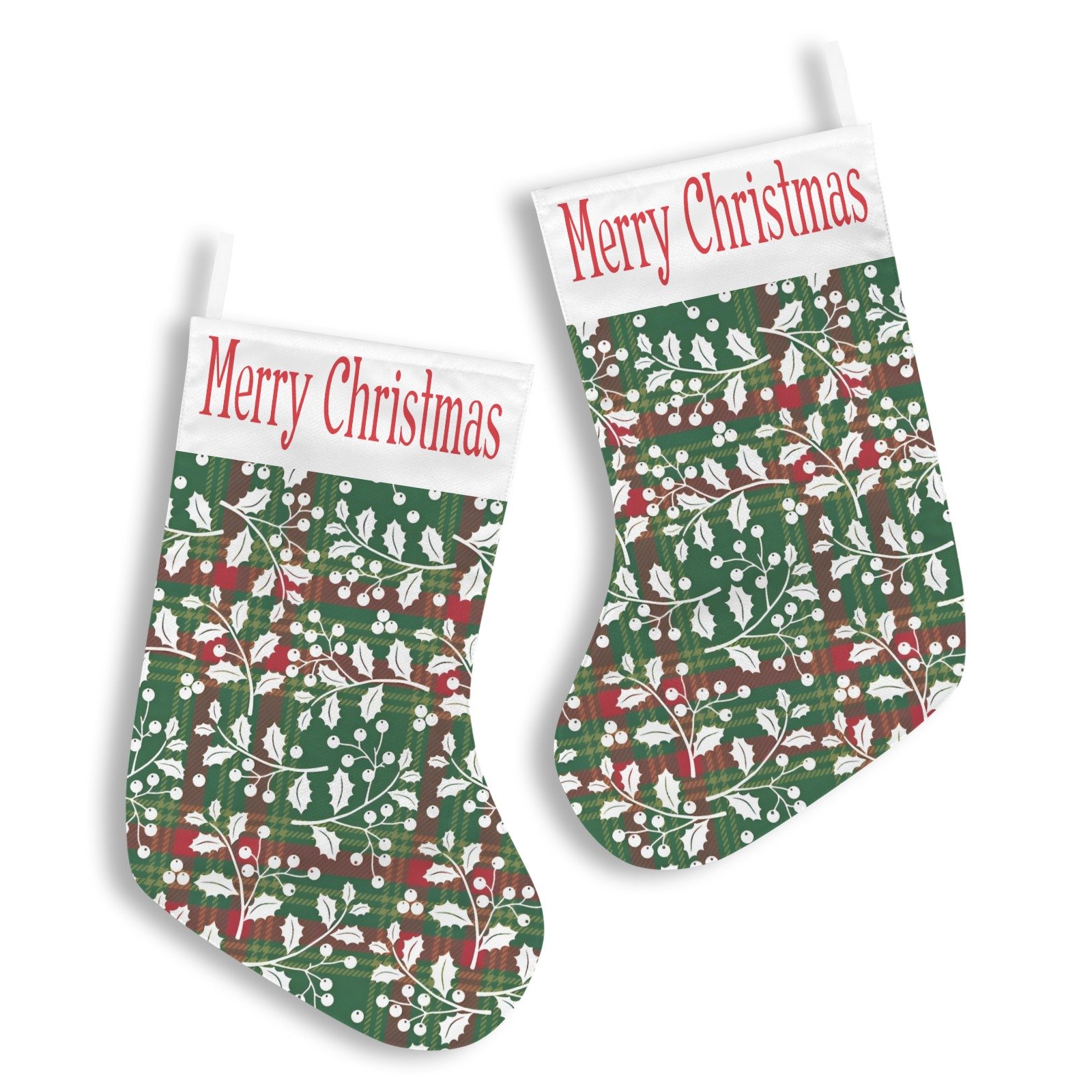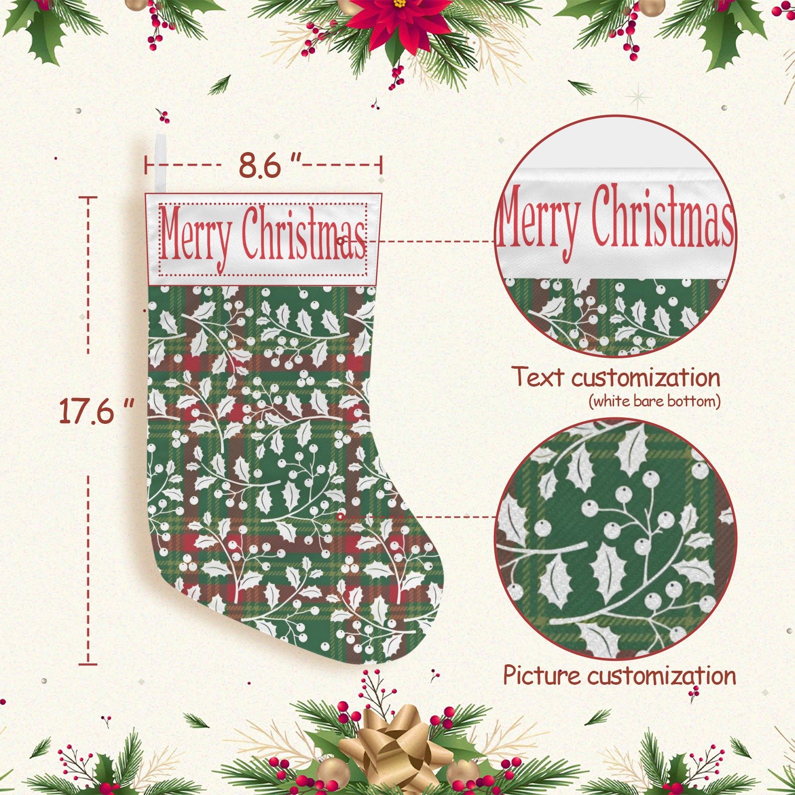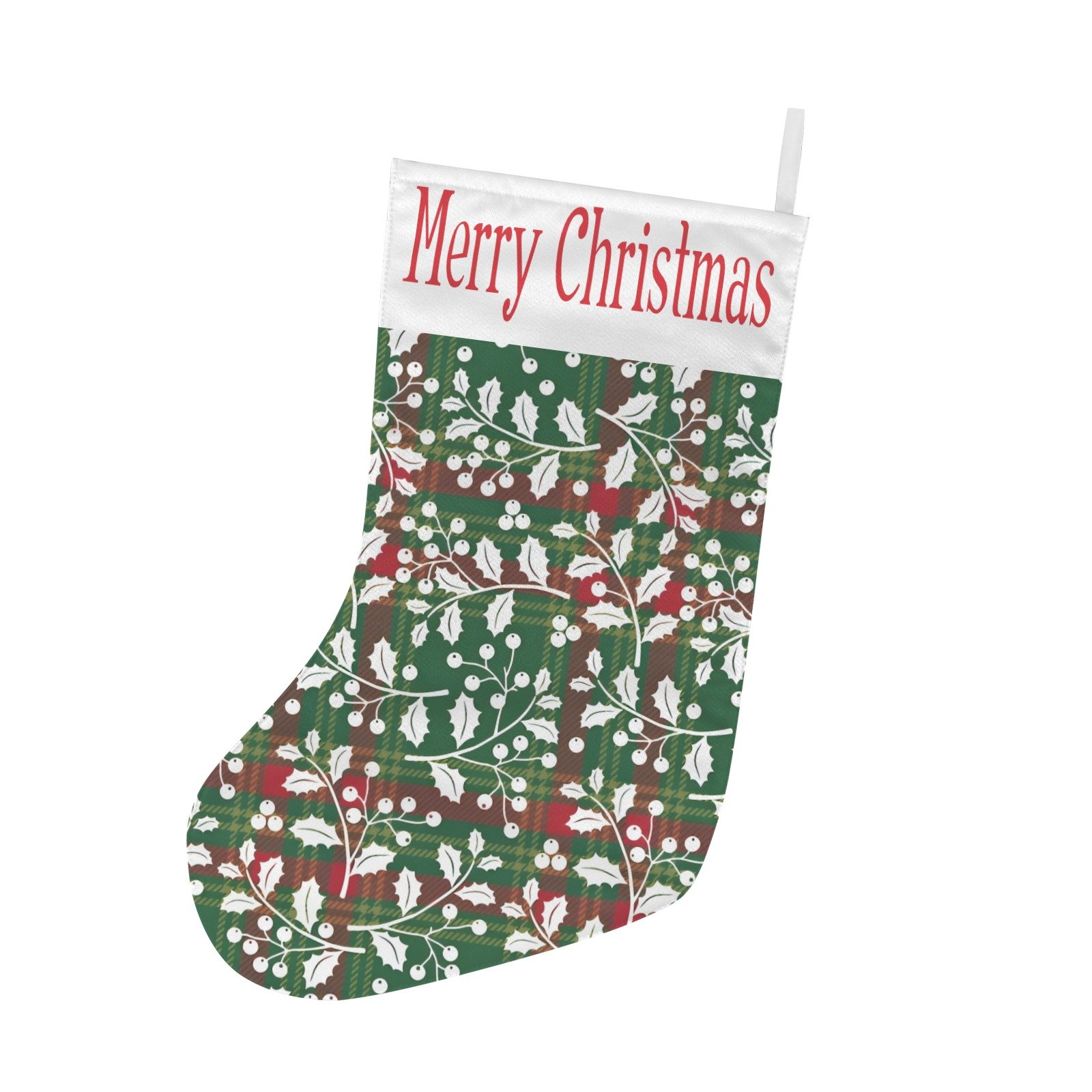 Add festive sophistication to your holiday celebrations with the Christmas Stockings | Holiday Stocking Sock | White Holly. Featuring white holly leaves, berries, and branches over a classic green and red plaid background, this stocking brings a traditional yet striking touch to your Christmas setup.
