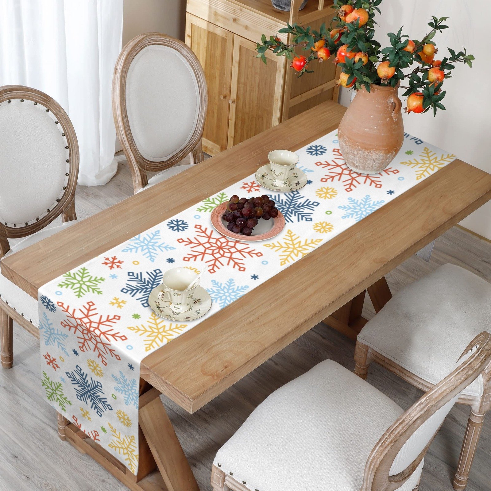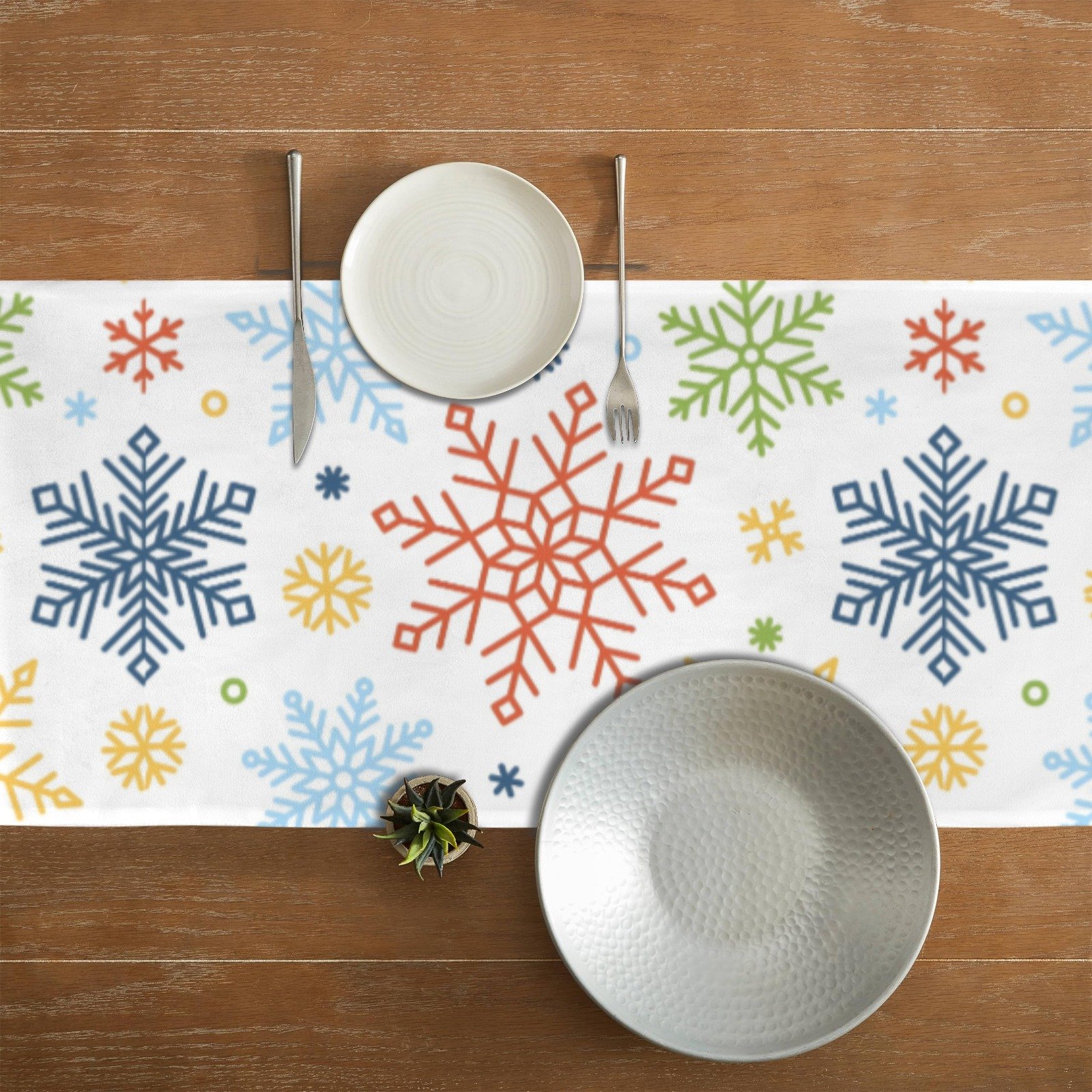 Bring a cheerful and festive touch to your holiday dining with the Christmas Table Runner | Colored Flakes | Holiday Dinner Table Decor. Featuring colored snowflakes on a crisp white background, this runner adds a vibrant and joyful accent to your Christmas dinner table, holiday gatherings, or seasonal entertaining.