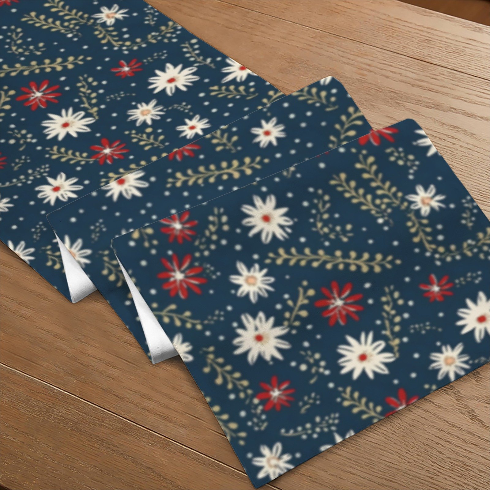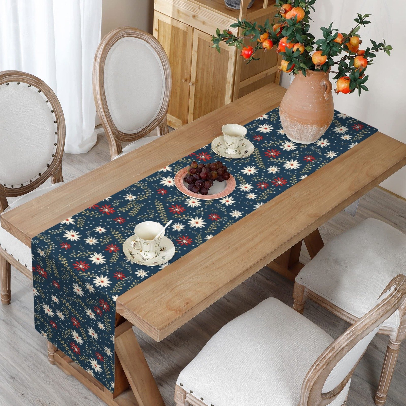 Bring vibrant holiday charm to your table with the Christmas Table Runner | Daisy | Holiday Dinner Table Decor. This festive runner features white and red daisies on a rich blue background, creating a lively and cheerful centerpiece for your Christmas table decoration and holiday dining table decor.