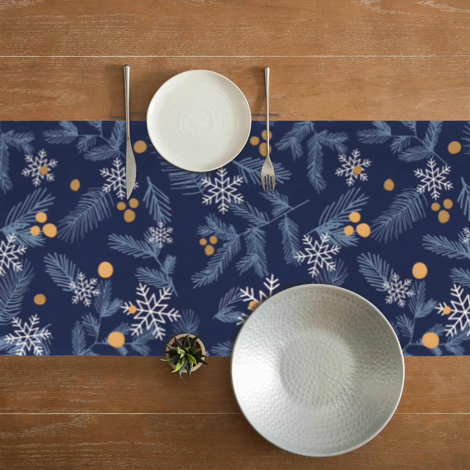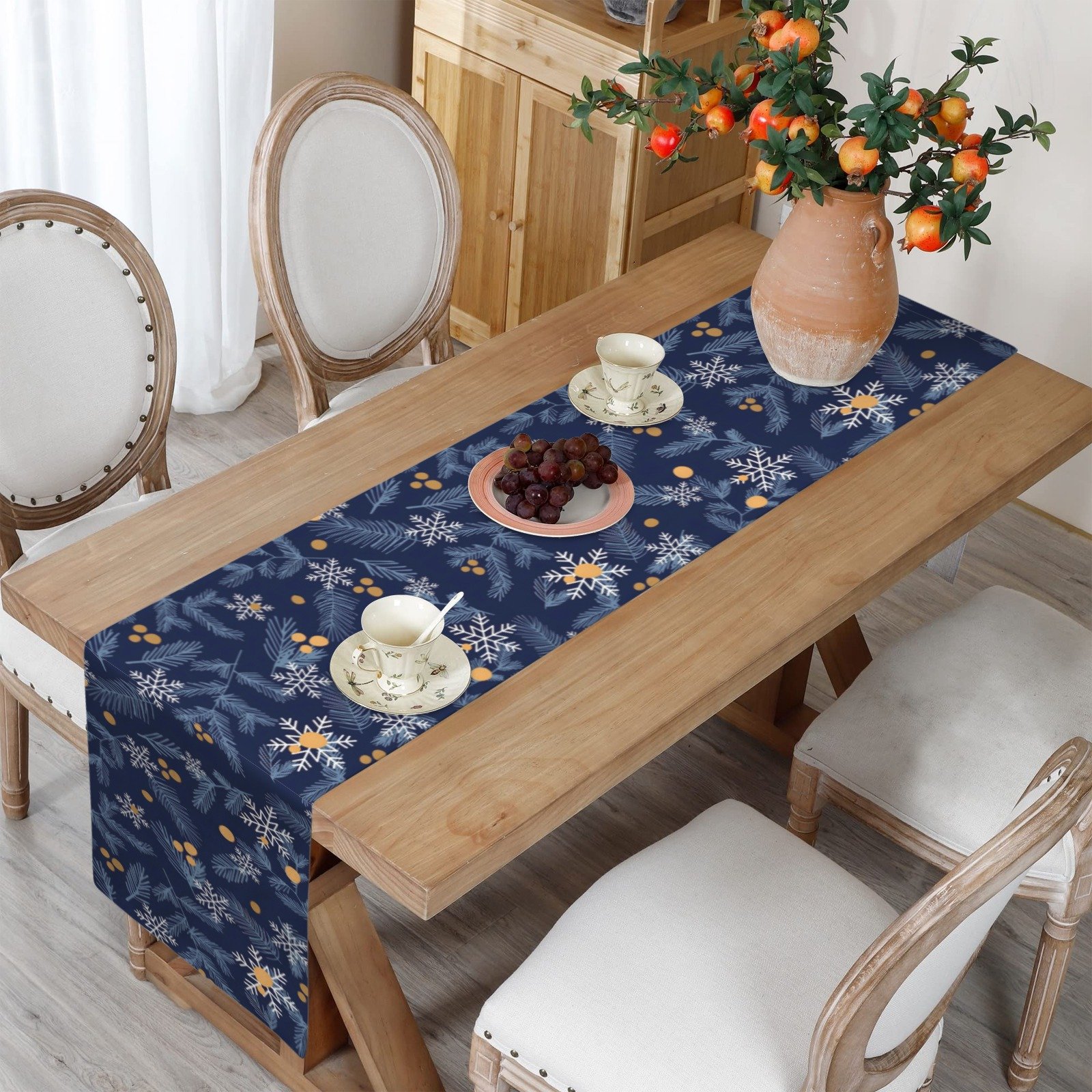 Bring festive elegance to your holiday dining with the Christmas Table Runner | Gold Berries | Holiday Dinner Table Decor. Featuring gold berries, white pine branches, and delicate snowflakes on a rich blue background, this runner adds a sophisticated and seasonal accent to your Christmas dinner table, holiday gatherings, or festive entertaining.