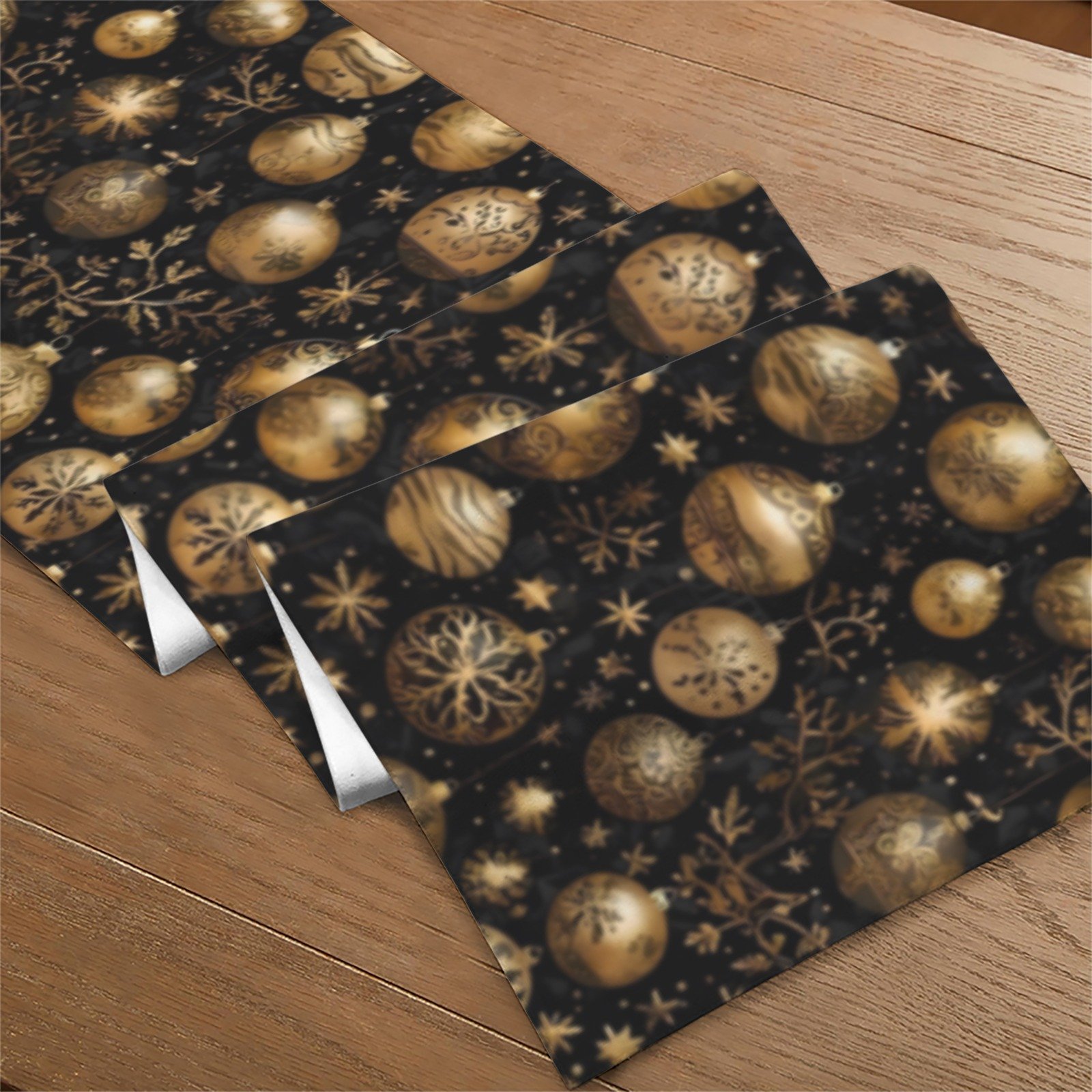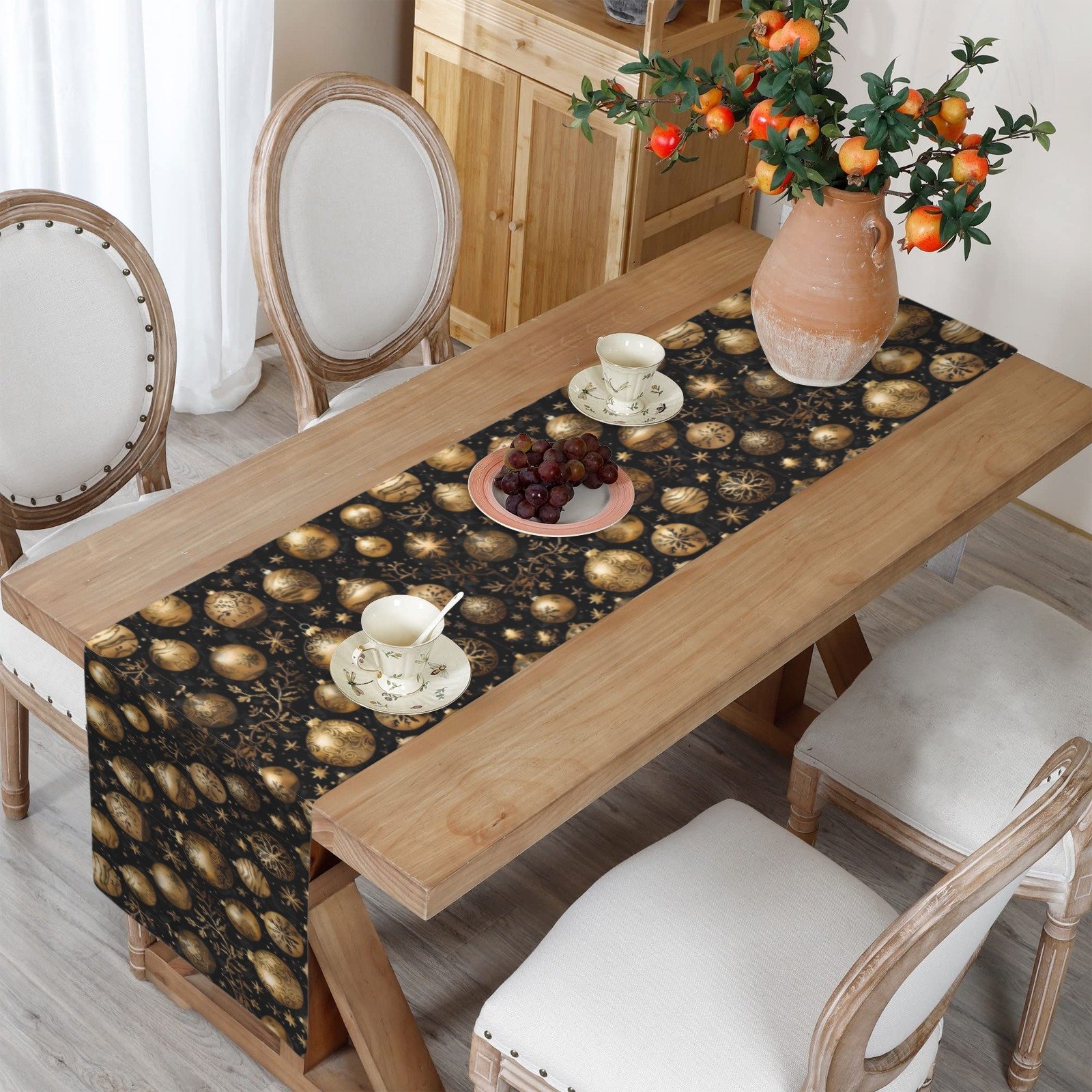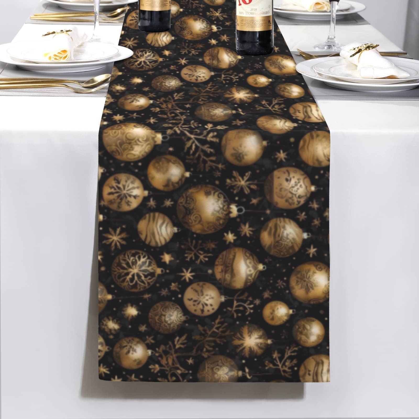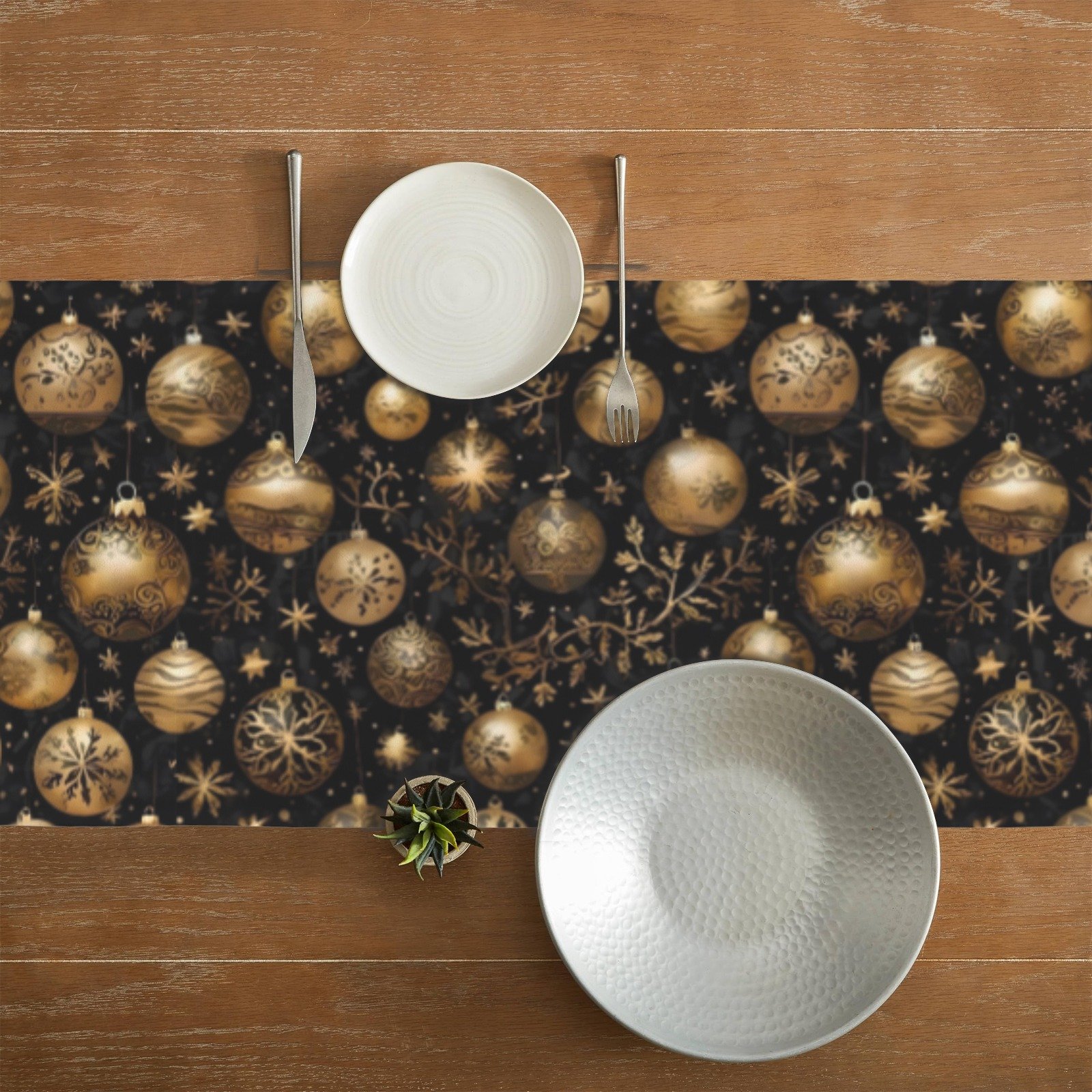 Perfect for pairing with candles, centerpieces, or festive dinnerware, the Gold Ornaments Table Runner enhances your holiday table decor while complementing your Christmas table linens and Christmas home decor.