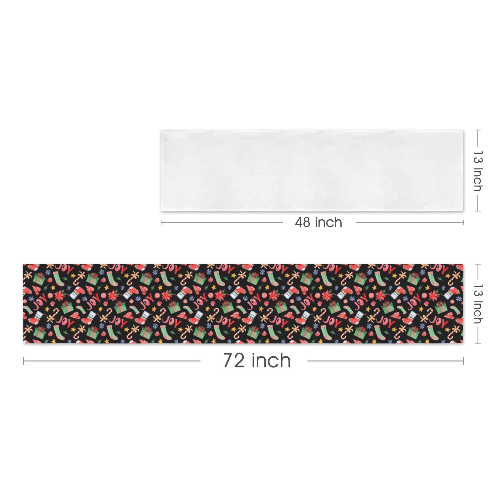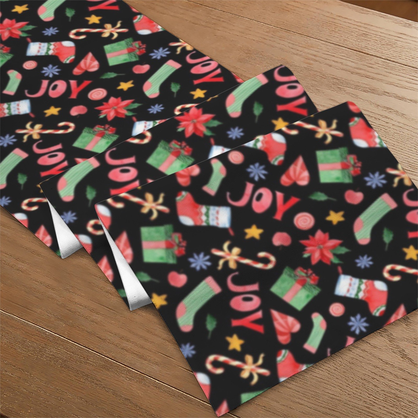 Celebrate the season with a vibrant and festive look using the Christmas Table Runner | Joy | Holiday Dinner Table Decor. Featuring stockings, candy canes, gifts, and cheerful “Joy” text on a colorful background, this Christmas table runner brings playful charm and holiday cheer to your holiday table runner setup, Christmas dinner table, or holiday dining table decor.
