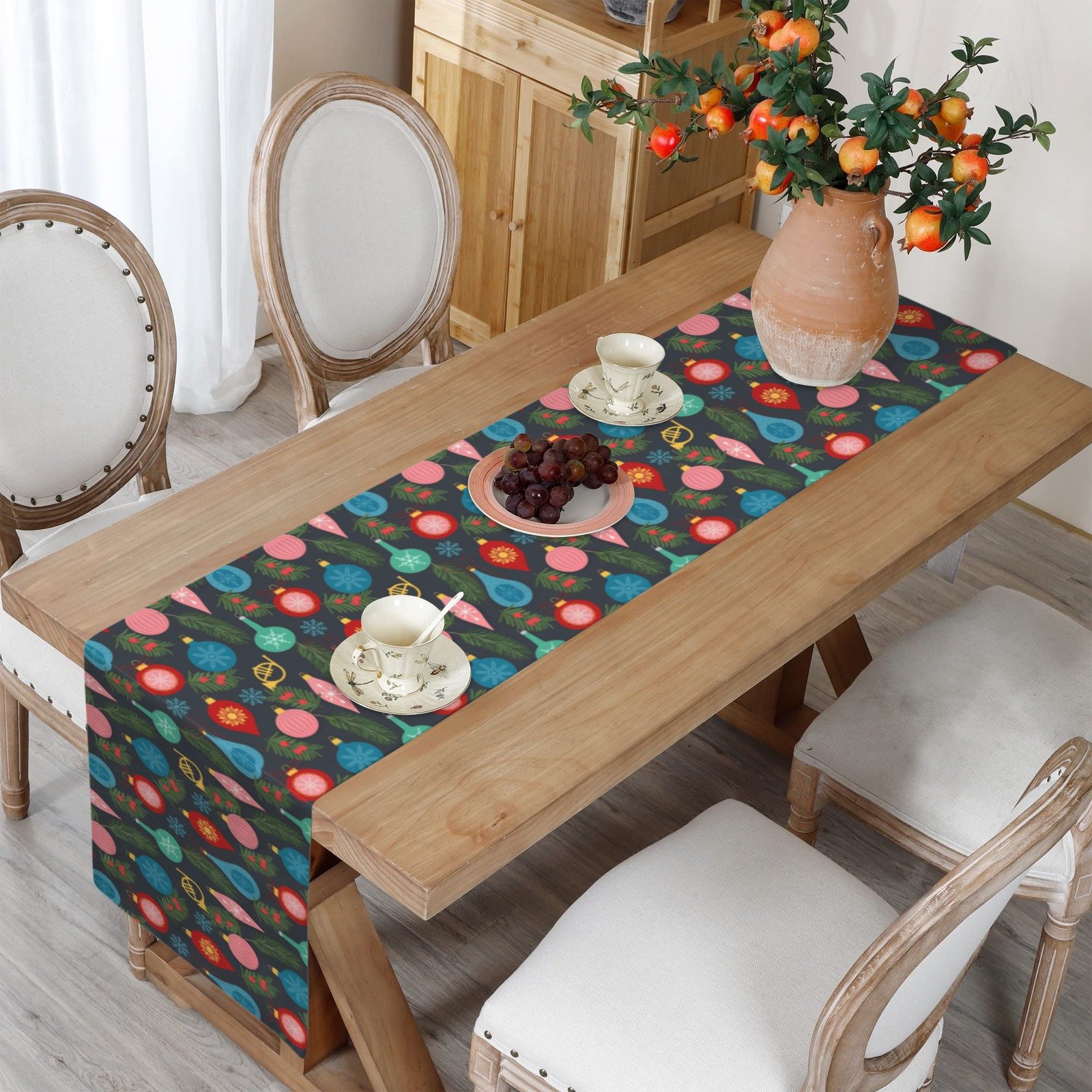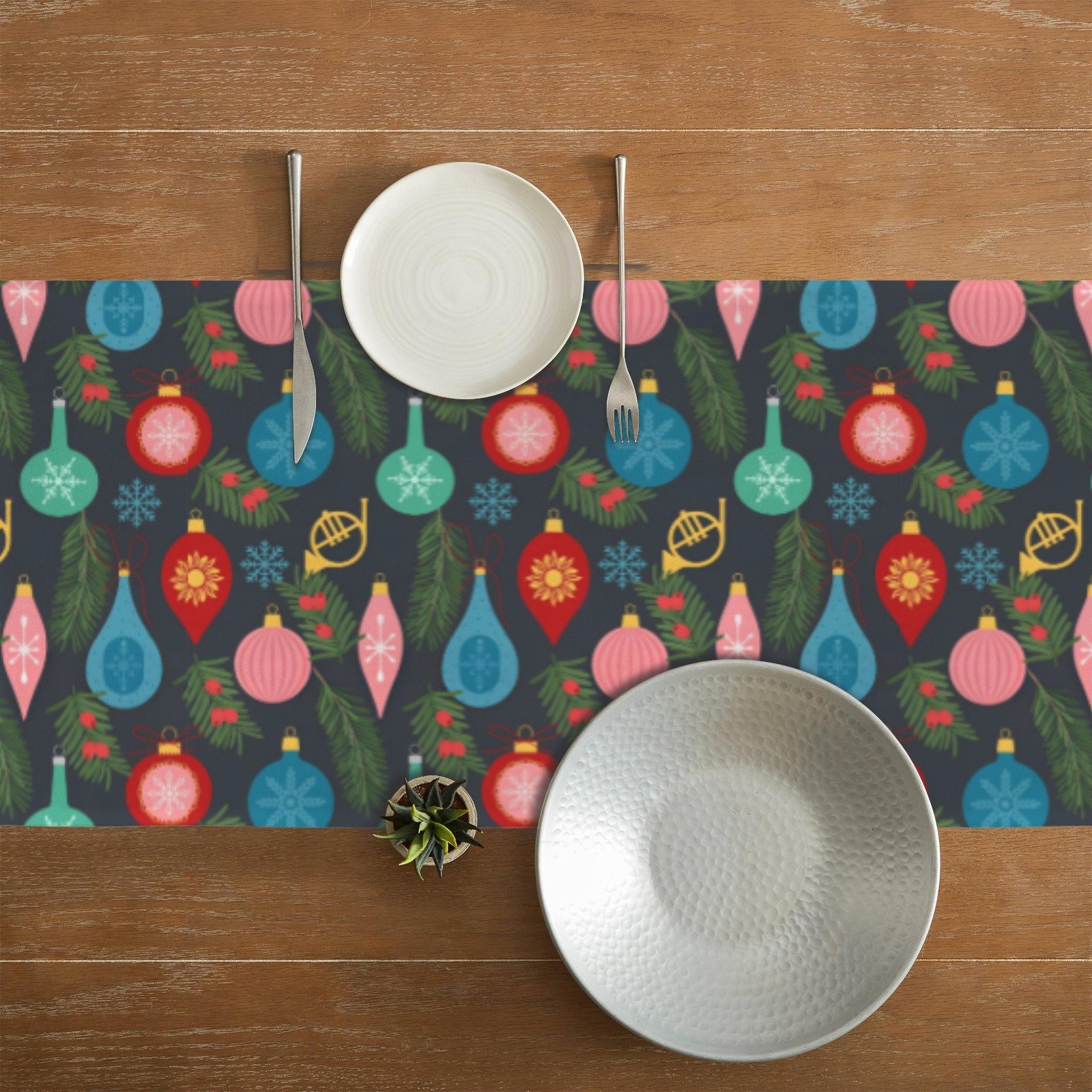 Bring classic holiday magic to your dining space with the Christmas Table Runner | Ornaments | Holiday Dinner Table Decor. This festive Christmas table runner features an array of colorful Christmas ornaments in various shapes and hues, capturing the joyful spirit and sparkle of the season. Perfect for brightening any Christmas dinner table, holiday table setting, or Xmas table runner display, it creates a warm and inviting atmosphere your guests will love.