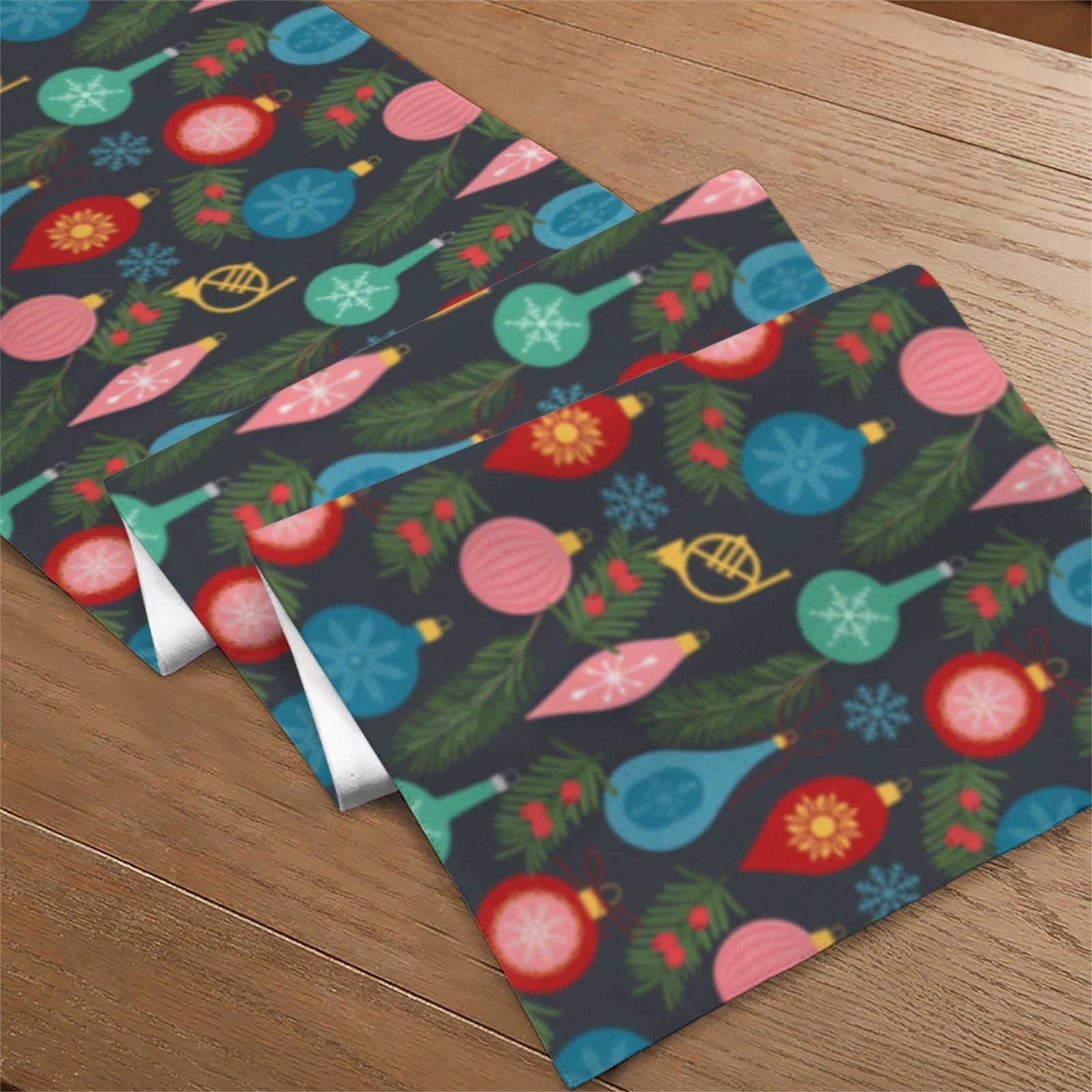 The Ornaments design adds playful holiday cheer while maintaining a refined, elegant look suitable for both modern and traditional interiors. It beautifully complements Christmas table linens, holiday dining table decor, and Christmas home decor themes.
