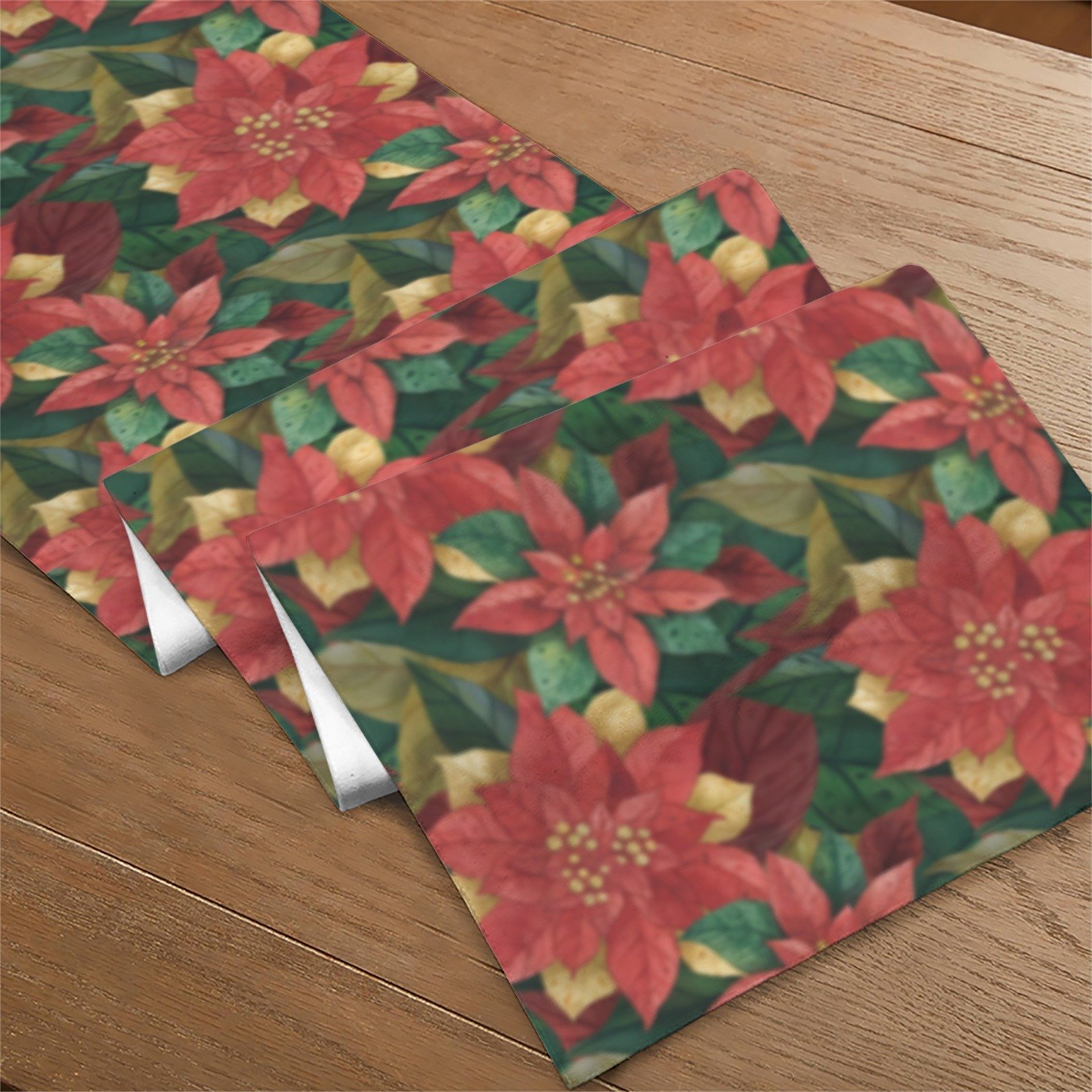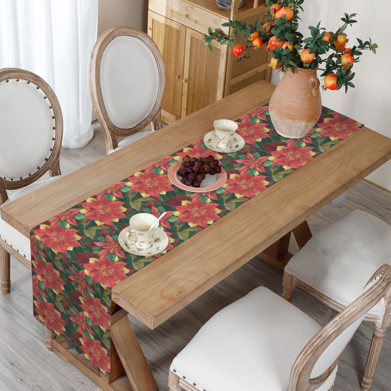 Brighten your holiday dinner table decor with the Christmas Table Runner | Poinsettias, featuring rich red poinsettias and green leaves that bring traditional Christmas charm and timeless floral beauty to your Christmas home decor.