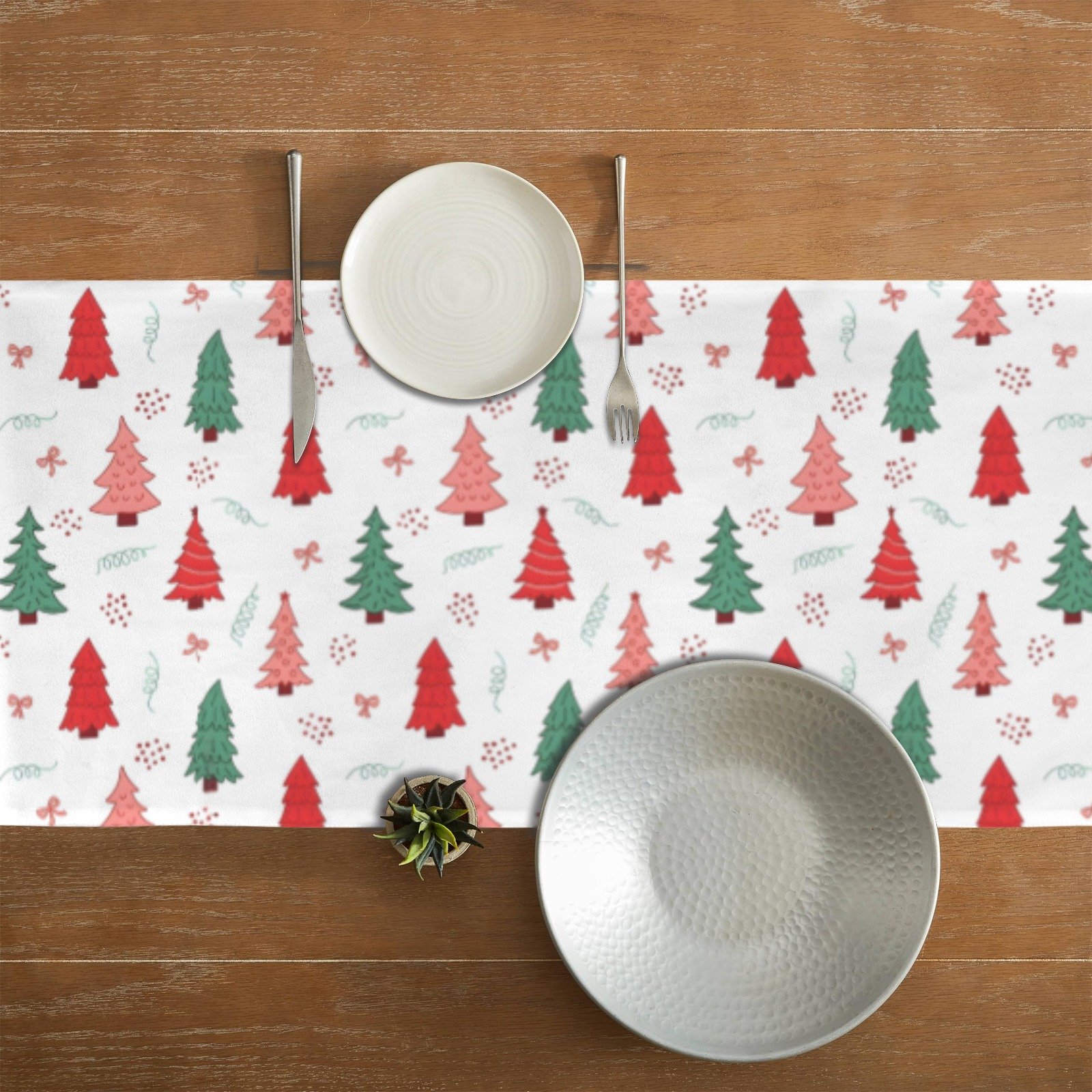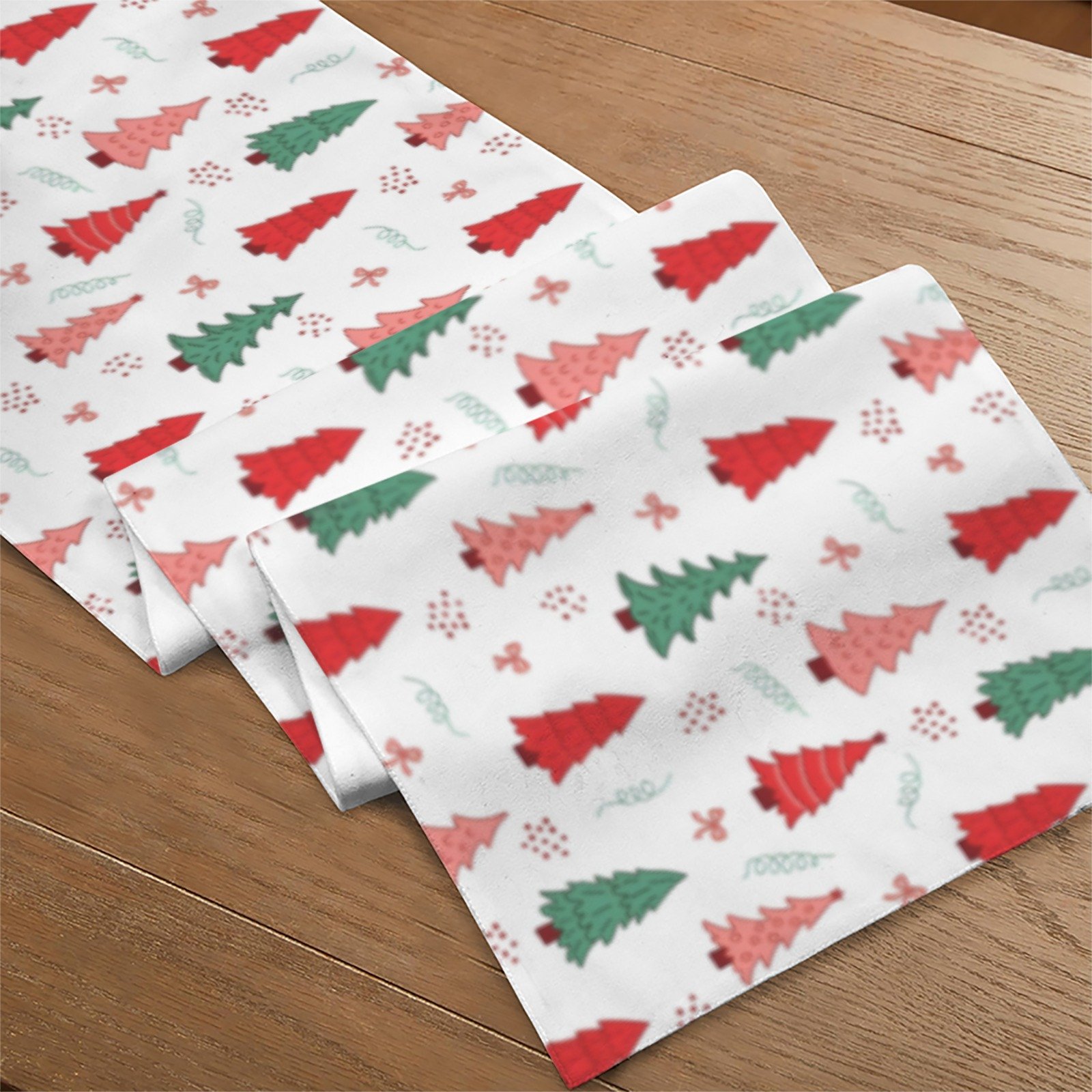 Bring a festive and cheerful touch to your holiday table with the Christmas Table Runner | Ribbon Forest | Holiday Dinner Table Decor. Featuring red, pink, and green fir trees adorned with red ribbons on a crisp white background, this Christmas table runner adds a playful yet elegant accent to your holiday table runner setup, Christmas dinner table, or holiday dining table decor.