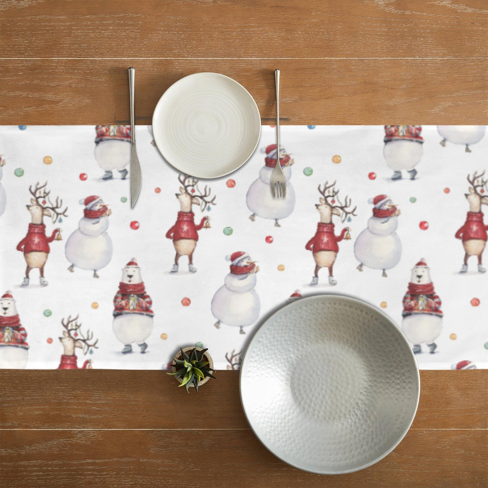 Create a fun and festive holiday table with the Christmas Table Runner | Snow Friends | Holiday Dinner Table Decor. This playful runner features snowmen and polar bear pals on a cheerful background, making it a delightful centerpiece for Christmas table decoration and holiday dining table decor.
