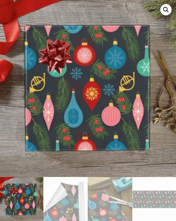 Add musical charm to your gifts with French Horn Christmas Wrapping Paper. Features ornaments and French horns on premium 6.35 oz. paper, 58″x23″. Available in 1–5 roll packs. Printed in the USA.