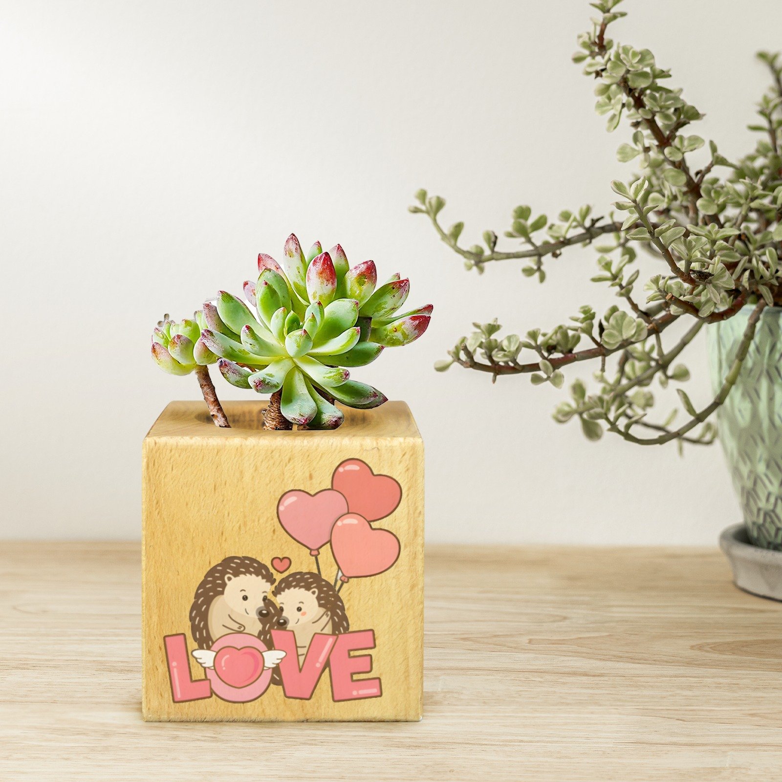 Mini Flower Pot, Valentine’s Indoor Wooden Desk Planter – Hedgehogs