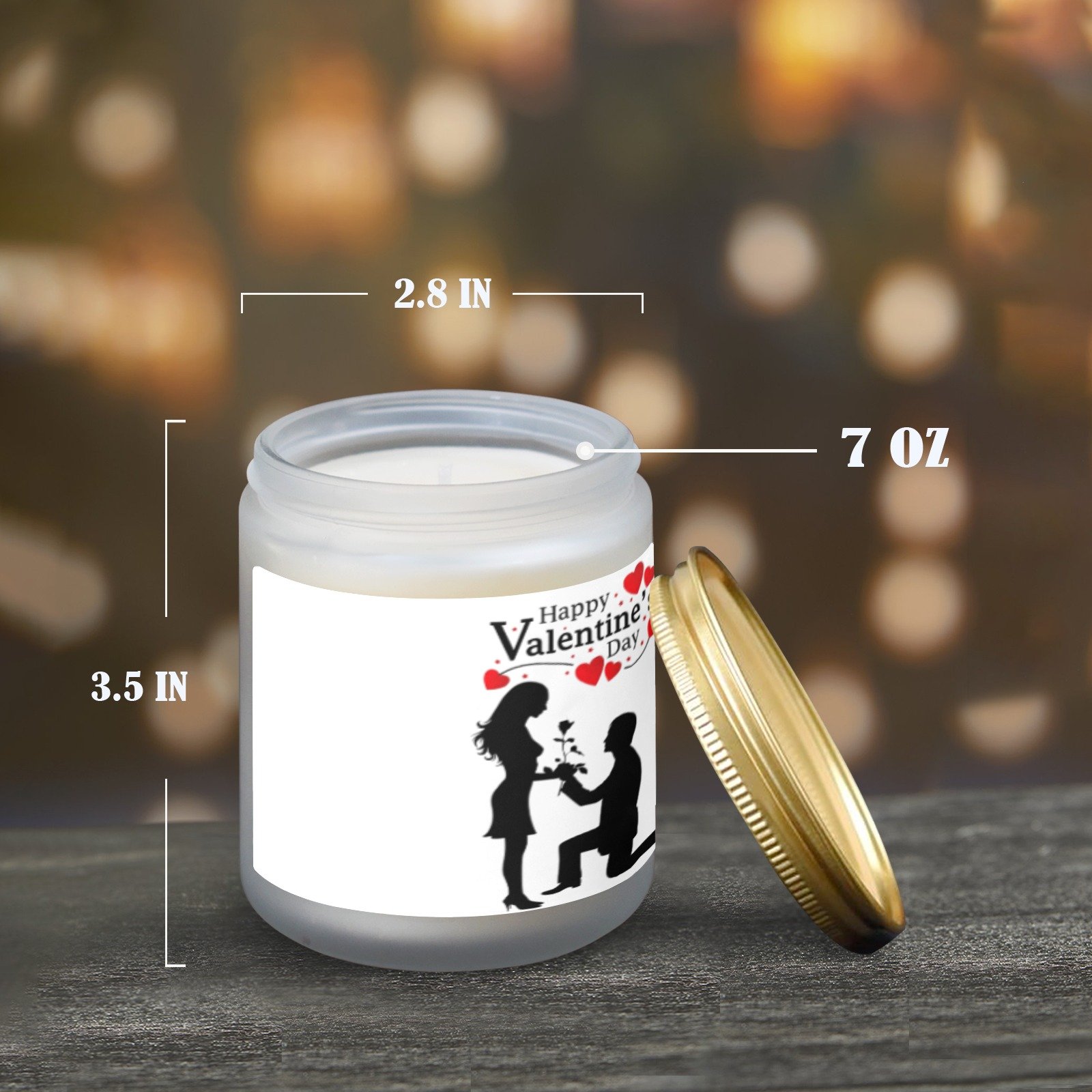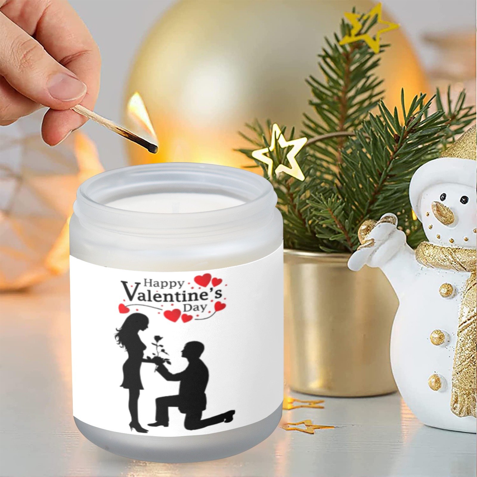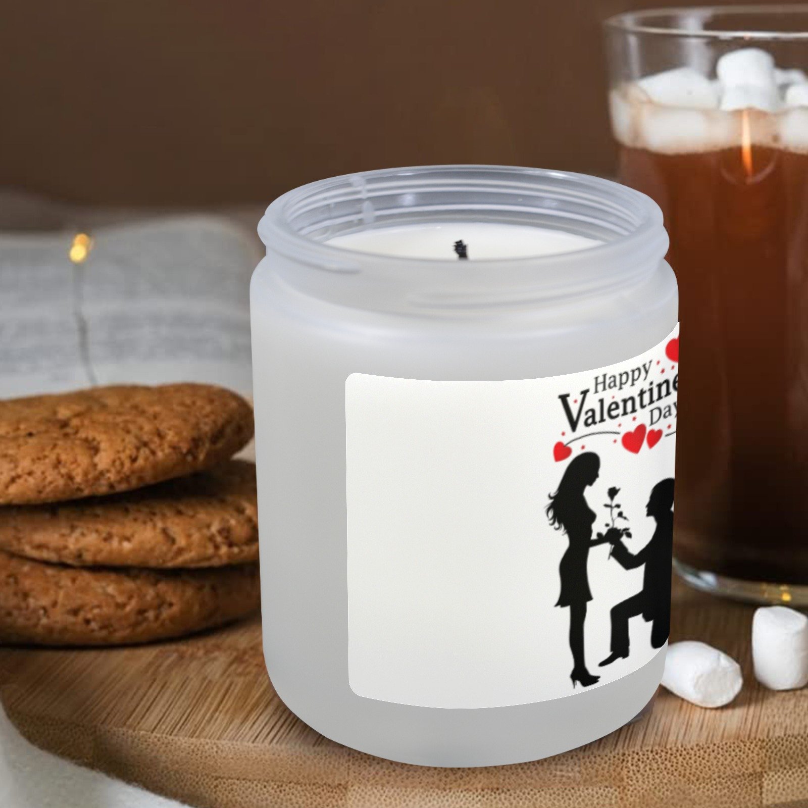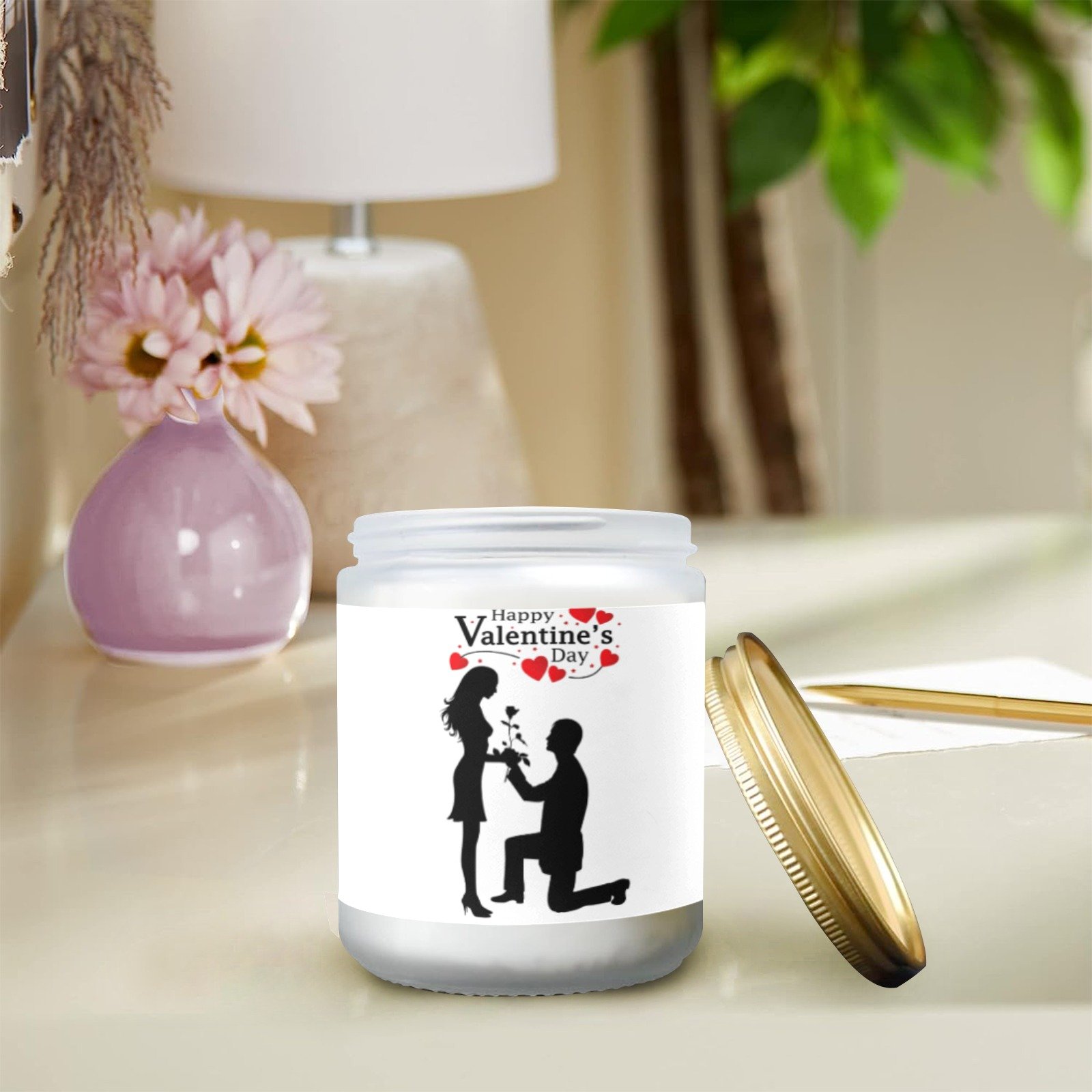Celebrate love with this Valentine’s Proposal scented glass jar candle. The candle features a romantic Proposal design printed on a frosted glass jar, combining decorative style with gentle fragrance for indoor use.